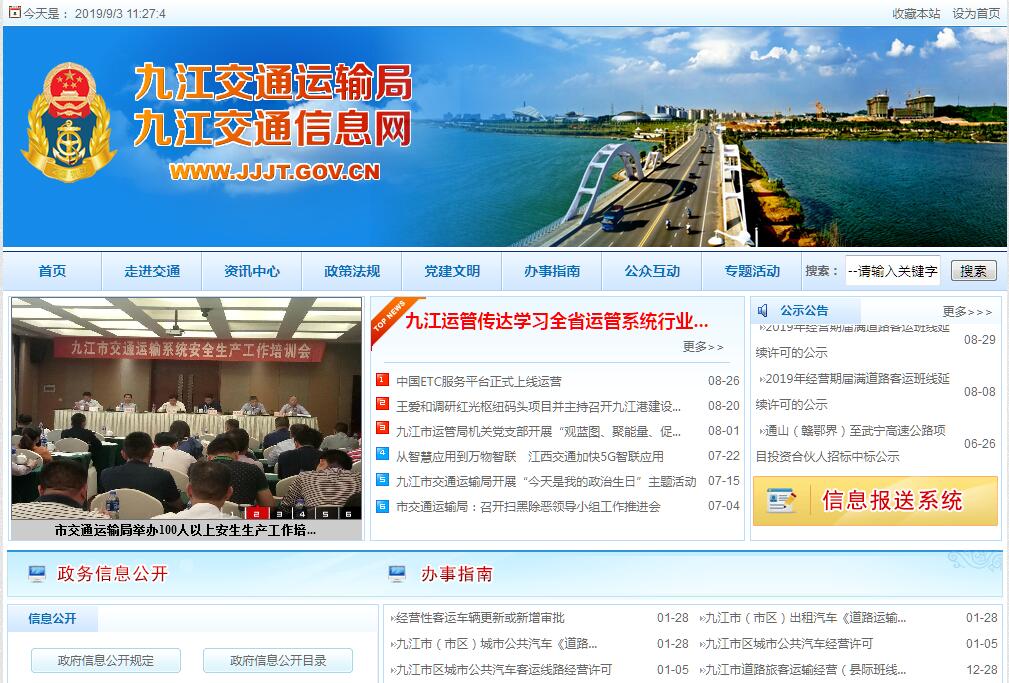 九江市交通运输局属市政府工作部门,为正处级单位。负责贯彻执行党中央、省委关于交通运输方面的方针政策和决策部署。内设办公室、运输管理科、安全监督科、法规科、政务服务科、规划建管科、人事科、财务科等8个职能科室和市交通战备办公室、机关党委两个机构。直属事业单位4个:市公路管理所(市渡口管理所)、市交通工程质量监督所、九江民航管理局、九江市道路运输管理局;直属企业单位2个:九江市装卸运输公司和九江市航运总公司。全市15个县(市、区、山)设交通运输局(浔阳区除外),归所在县(市、区)人民政府领导,业务上接受市交通运输局指导。其主要职责是:(一)贯彻执行国家和省有关交通运输的法律法规和政策, 编制全市境内普通公路的发展规划、中长期计划,拟订全市公路行业规定、标准,指导公路有关体制改革工作。(二)在全市经济社会发展总体规划的框架内,组织编制道路运输体系规划,协调民航相关工作。(三)指导交通运输行业安全生产和应急管理工作。按规定组织协调重点物资运输和紧急客货运输。(四)承担道路运输市场监管责任。指导城乡客运及有关设施规划和管理工作。负责汽车运输有关管理工作。(五)负责交通工程建设市场监管工作。执行交通工程建设相关政策、制度和技术标准并监督实施。指导交通运输基础设施管理和维护。(六)负责交通运输行业政务服务工作。(七)指导交通运输信息化建设,监测分析运行情况,开展相关统计工作,发布有关信息。指导公路行业环境保护和节能减排工作。(八)负责全市国防交通战备工作。(九)完成市政府交办的其他任务。