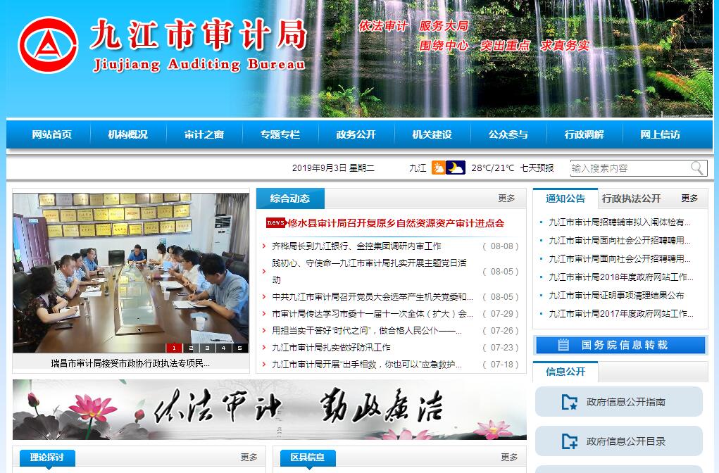 九江市审计局的主要职责是:(一)主管全市审计工作。负责对全市财政收支和法律法规规定属于审计监督范围的财务收支的真实、合法和效益进行审计监督,对公共资金、国有资产、国有资源和领导干部履行经济责任情况实行审计全覆盖,对领导干部实行自然资源资产离任审计,对国家、省、市有关重大政策措施贯彻落实情况进行跟踪审计。对审计、专项审计调查和核查社会审计机构相关审计报告的结果承担责任,并负有督促被审计单位整改的责任。(二)起草地方性审计法规草案,制定审计规章制度并监督执行。制定并组织实施全市专业领域审计工作规划。参与起草全市地方性财政经济及其相关的法规草案。对直接审计、调查和核查的事项依法进行审计评价,作出审计决定或提出审计建议。(三)向市委审计委员会提出年度市级预算执行和其他财政支出情况审计报告。向市长提出年度市级预算执行和其他财政收支情况的审计结果报告。受市政府委托向市人大常委会提出市级预算执行和其他财政收支情况的审计工作报告、审计查出问题整改情况报告。向市委和市政府报告对其他事项的审计和专项审计调查情况及结果。依法向社会公布审计结果。向市委和市级国家机关有关部门、县(市、区)党委和政府通报审计情况和审计结果。(四)直接审计下列事项,出具审计报告,在法定职权范围内作出审计决定,包括:1、国家、省、市有关重大政策措施贯彻落实情况;2、市级预算执行情况和其他财政收支,市本级各部门(含直属单位)预算执行情况、决算草案和其他财政收支;3、县(市、区)政府预算执行情况、决算草案和其他财政收支,中央、省级、市级财政转移支付资金;4、使用市财政资金的事业单位和社会团体的财务收支;5、全市自然资源管理、污染防治和生态保护与修复情况;6、市属国有企业和金融机构、市属国有资本占控股或主导地位的企业和金融机构境内资产、负债和损益,市政府驻外非经营性机构的财务收支;7、有关社会保障基金、社会捐赠资金和其他基金、资金的财务收支;8、国际组织和外国政府援助、贷款项目;19、参与审计署、省审计厅统一组织的审计事项;10、法律法规规定的其他事项。(五)对市政府投资和以市政府投资为主的建设项目的预算执行情况和决算进行审计监督,市级重大公共工程项目的资金管理使用和建设运营情况进行审计监督;(六)按规定对县处级党政主要领导干部及其他单位主要负责人实施经济责任审计和自然资源资产离任审计。(七)组织实施对国家财经法律法规、规章、政策和宏观调控措施执行情况、财政预算管理及国有资产管理使用等与国家财政收支有关的特定事项进行专项审计调查。(八)依法检查审计决定执行情况,督促整改审计查出的问题,依法办理被审计单位对审计决定提请行政复议、行政诉讼或市政府裁决中的有关事项,协助配合有关部门查处相关重大案件。(九)指导和监督内部审计工作,核查社会审计机构对依法属于审计监督对象的单位出具的相关审计报告。(十)与县(市、区)党委和政府共同领导县(市、区)审计机关,依法领导和监督县(市、区)审计机关的业务,组织县(市、区)审计机关实施特定项目的专项审计或审计调查,纠正或责成纠正县(市、区)审计机关违反国家规定作出的审计决定。按照干部管理权限协管县(市、区)审计机关负责人。(十一)参与审计领域的国际交流与合作,指导和推广信息技术在全市审计领域的应用。(十二)完成审计署、省审计厅和市委、市政府交办的其他任务。