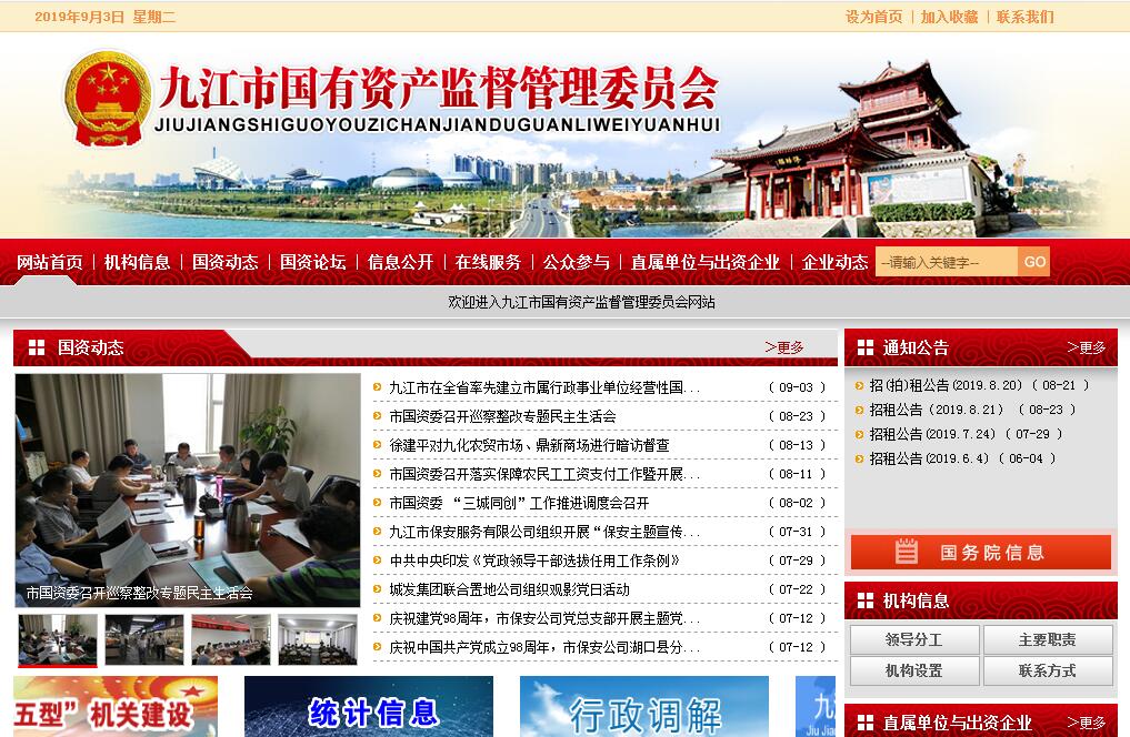 九江市国有资产监督管理委员会主要职责:(一)根据市政府授权,依照《中华人民共和国公司法》、《企业国有资产法》等法律和行政法规,代表市政府履行出资人职责,监管所监管企业的国有资产,加强国有资产的管理工作。(二)承担监督所监管企业国有资产保值增值的责任。建立和完善国有资产保值增值指标体系,制订考核标准,通过统计、稽核等方式对所监管国有资产的保值增值情况进行监管,负责组织所监管企业上交国有资本金收益,负责所监管企业工资分配管理工作,制定所监管企业负责人收入分配政策并组织实施。(三)指导推进国有企业改革和重组,推进国有企业的现代企业制度建设,完善公司治理结构,推动国有经济布局和结构的战略性调整。(四)通过法定程序对所监管企业负责人进行任免、考核,并根据其经营业绩进行奖惩。建立符合社会主义市场经济体制和现代企业制度要求的选人、用人机制,完善经营者激励和约束制度。(五)代表市政府向所监管企业派出董事会、监事会,负责董事会、监事会的日常管理工作。(六)对市属行政事业单位经营性国有资产履行出资人职责,制订、执行相应的经营管理制度和方案,经审批后对被授权经营的市属行政事业单位经营性国有资产实行统一经营管理。(七)履行市委规定的企业党的建设方面的职责。(八)负责企业(含地方金融企业和企业化管理事业单位)国有资产基础管理,按照有关规定,批准国有资产产权转让。起草国有资产管理的地方规范性文件,拟定有关规章、制度。(九)依法对县(市、区)国有资产管理进行指导和监督。(十)承办市政府交办的其他事项。
