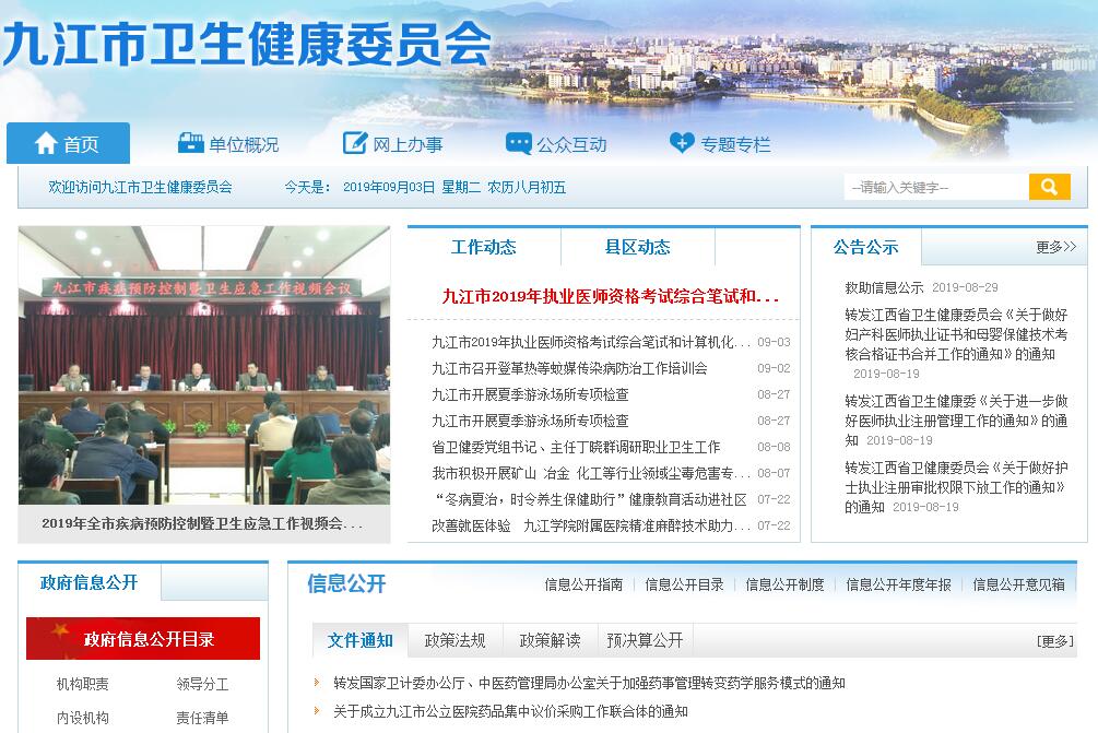 九江市卫生健康委员会主要职责是:(一)贯彻执行国家和省有关卫生和计划生育、中医药事业发展的法律法规和方针政策,负责起草我市卫生和计划生育、中医药事业发展规划。协调推进全市医药卫生体制改革和医疗卫生保障,统筹规划卫生和计划生育服务资源配置,指导各县(市、区)卫生和计划生育规划的编制和实施。(二)贯彻执行国家和省疾病预防控制规划、国家免疫规划,制定严重危害人员健康的公共卫生问题的干预措施并组织落实,制定全市卫生应急和紧急医学救援预案、突发公共卫生事件监测和风险评估计划,组织和指导突发公共卫生事件预防控制和各类突发公共事件的医疗卫生救援,报告传染病疫情信息、突发公共卫生事件应急处置信息。(三)负责职责范围内的职业卫生、放射卫生、环境卫生、学校卫生、公共场所卫生、饮用水卫生管理规范、标准和政策措施落实情况的相关监测、调查、评估和监督,负责传染病防治监督。组织开展食品安全风险监测、评估。(四)负责组织拟订并实施基层卫生和计划生育服务、妇幼卫生发展规划和措施,指导全市基层卫生和计划生育、妇幼卫生服务体系建设,推进基本公共卫生和计划生育服务均等化,完善基层运行新机制和乡村医生管理制度,负责全市新型农村合作医疗监督管理工作。(五)负责医疗机构和医疗服务全行业管理和监督,贯彻执行医疗机构及其医疗服务、医疗技术、医疗质量、医疗安全以及采供血机构管理的规范、标准,推动无偿献血工作,会同有关部门实施卫生专业技术人员资格标准,实施卫生专业技术人员执业规则和服务规范,建立医疗服务评价和监督管理体系。(六)负责组织推进公立医院改革,建立公益性为导向的绩效考核和评价运行机制,建设和谐医患关系,提出医疗服务和药品价格政策的建议。(七)贯彻落实国家药物政策和国家基本药物制度,协助有关部门参与执行国家药品法典,执行国家基本药物目录及省药品增补目录,拟订我市基本药物采购、配送、使用管理制度的落实措施。(八)贯彻落实国家计划生育政策,组织实施促进出生人口性别平衡的政策措施,组织监测计划生育发展动态,制定计划生育技术服务管理制度并监督实施。制定优生优育和提高出生人口素质的落实措施并组织实施,实施计划生育生殖健康促进计划,降低出生缺陷人口数量。(九)组织建立计划生育利益导向、计划生育特殊困难家庭扶助和促进计划生育家庭发展等机制。负责协调推进有关部门、群众团体履行计划生育工作相关职责,建立与经济社会发展政策相衔接的机制,落实稳定低生育水平政策措施。(十)执行全市流动人口计划生育服务管理制度并组织落实,建立流动人口卫生和计划生育信息共享和公共服务工作机制。(十一)组织拟订全市卫生和计划生育人才发展规划,指导卫生和计划生育人才队伍建设。加强全科医生等急需紧缺专业人才培养,建立完善住院医师和专科医师规范化培训制度并指导实施。(十二)组织拟订卫生和计划生育科技发展规划,组织实施卫生和计划生育相关科研项目;参与制定医学教育发展规划,组织开展继续医学教育和毕业后医学教育工作。(十三)指导各地卫生和计划生育工作,完善综合监督执法体系,规范执法行为,监督检查法律法规和政策措施的落实,依法组织查处重大违法行为。负责拟订计划生育目标管理方案,组织计划生育工作考评,监督落实计划生育一票否决制。(十四)负责卫生和计划生育宣传、健康教育、健康促进和信息化建设等工作,依法组织实施统计调查,参与市人口基础信息库建设。组织指导卫生和计划生育方面的国际合作交流与援外工作,开展与港澳台的卫生和计划生育合作与交流。(十五)制定全市中医药中长期发展规划,将其纳入全市卫生和计划生育事业发展总体规划和战略目标,并组织实施。(十六)负责市保健对象的医疗保健工作,负责市级部门有关干部医疗管理工作,负责全市重要会议与重大活动的医疗卫生保障工作。(十七)承担市政府血吸虫病地方病防治领导小组的具体工作,组织协调各有关部门开展血吸虫病、地方病的综合防治和科研监测工作。(十八)承担市爱国卫生运动委员会、市深化医药卫生体制改革领导小组和市防治艾滋病工作委员会的日常工作。(十九)承办市政府交办的其他事项。