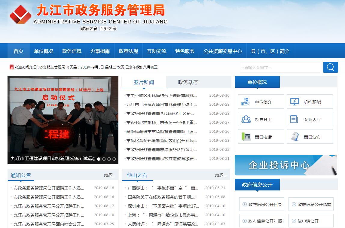 九江市政务服务管理局2019年1月2日正式组建,前身是九江市行政服务中心管委会,下属副处级事业单位公共资源交易中心。九江市政务服务管理局,发展至今,始终坚持贯彻落实中央和省、市关于深化“放管服”改革优化政务服务工作的决策部署,坚持问题导向,以“放管服”改革为主线,进一步强化服务意识、改革意识和担当意识,当好企业群众的“服务员”“店小二”,主动服务、靠前服务、周到服务,提升行政效率和服务质量,用优质、高效、便捷的政务服务,换取企业群众的笑脸。近年来,先后荣获中国政务服务标准化贡献奖、第二届全国“十佳百优”政务服务大厅信息化优秀大厅、全省服务非公经济发展先进单位等称号。九江市政务服务管理局是在九江市行政服务中心管理委员会基础上组建,为市政府工作部门,正处级。内设办公室、行政审批制度改革科(法规科)、运行管理科(督查科)、电子政务科、政务服务投诉科(市政府企业投诉中心)、5个职能科室和机关党委。其主要职责是:(一)贯彻执行国家和省行政审批制度改革、政务服务、公共资源交易等工作的法律法规、方针政策以及市委、市政府的决策部署,负责拟订全市相关工作发展规划并组织实施。(二)承担市行政审批制度改革领导小组的日常工作,指导、协调全市行政审批制度改革工作,协调落实国务院、省政府取消和下放的行政审批等事项,推进市级行政审批制度改革。(三)负责协调指导全市政务服务体系建设,拟订、实施政务服务标准规范。(四)负责全市政务服务管理工作,协调、指导和考核全市政务服务中心及分中心、政务服务热线平台的运行;承担管理、运行市政务服务中心、市级政务服务热线平台的工作。(五)负责对全市公共资源交易平台的管理、指导、协调和监督;承担市公共资源交易管理办公室的日常工作。(六)负责省政务服务网市、县级分厅的应用推进,统筹协调全市一体化在线政务服务平台建设。(七)完成市委、市政府交办的其他任务。