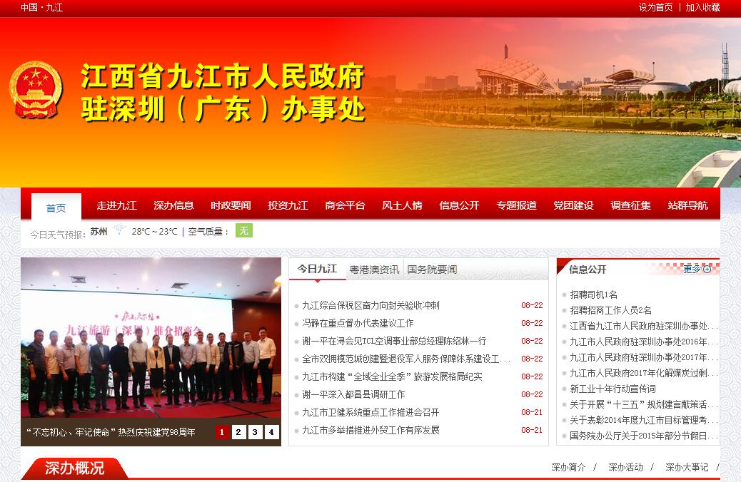 九江市人民政府驻深圳(广东)办事处系九江市人民政府派驻深圳、联系粤港澳的常设办事机构,成立于1989年。九江市政府驻深圳办事处主要职责是:(一)负责九江市在深圳(港、澳、珠三角地区)的重大政务、经济、科技活动的组织、联络、协调等工作。(二)为九江市引进资金、技术、人才和先进管理经验,为发展与所驻市的经济贸易、文化交流、旅游合作和政府间的公共关系牵线搭桥并提供服务;开展与在所驻市的国外和境外机构的业务联系,广泛宣传九江。(三)建立健全信息网络,强化综合信息处理手段,接受市委、市政府及有关部门的委托进行专题调研,为市领导机关及其他有关单位科学决策提供信息参考和咨询服务。(四)负责与驻市各界人士的联系,尤其是与九江籍和曾在九江工作过的老领导、老同志和中国科学院院士、中国工程院院士、专家、学者的联系,争取他们对九江建设和发展的支持帮助。(五)对九江市在深圳的劳务人员进行管理和跟踪服务;联系、组织九江市劳务人员在深圳谋职、就业,开拓九江市驻外联络(办事)处所在城市的劳务市场。(六)按照市委、市政府的要求,对县(市、区)、市直单位和大型企业在所驻市机构的业务工作进行指导和协调。(七)负责九江市县处级以上干部(含离退休的老同志)外出到所在驻市的接待服务工作;为市直单位和其他部门进行公务活动的人员提供方便。(八)承办九江市政府交办的其他工作。九江市人民政府驻深圳(广东)办事处围绕市委市政府大开发战略和九江跨越式发展目标,抓住泛珠三角区域合作契机,立足和依托深圳,做好九江与深、港、澳之间的经贸文化合作;做好深、港、澳企业赴九江投资的联络、协调和服务;开展九江与深、港、澳间劳务合作;做好对外宣传和九江与深、港、澳信息交流,促进相互了解和友好往来,不断拓展九江对外开放的领域和途径。