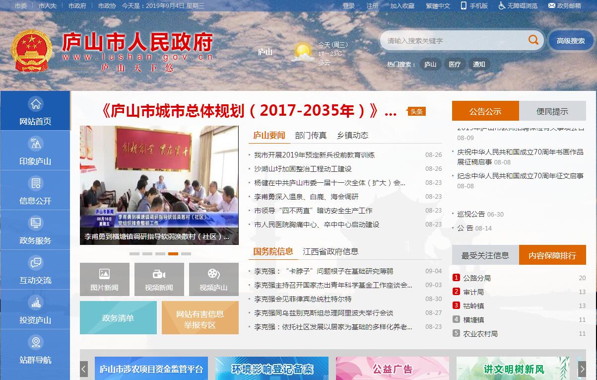 | 网站简介: 庐山市,江西省直辖市,九江市代管,地处江西省北部,九江市南部,背倚庐山,面临鄱阳湖,东与都昌县隔水为邻,西与柴桑区、德安县、共青城市接壤,北与濂溪区(原庐山区)相连,南与永修县湖洲相接。介于东经115°48′—116°10′、北纬29°8′—29°36′之间,东西宽35千米,南北长52千米,总面积913平方千米。庐山市是江西省第二个以景区命名的县级市,原名星子县,源于五代十国杨吴大和年间所设星子镇,因镇南湖中有“落星石”而得名。庐山市历史悠久,城区南康镇系故南康军、路、府治所在地。2016年,庐山市总人口达27.6万人。截至2018年,庐山市辖9个镇、1个乡,另设有1个林场、1个管理处,实现地区生产总值(GDP)130.41亿元,增长9%,三次产业比为6.4:28.9:64.7,城镇、农村居民人均可支配收入分别达到32585元、15474元。2018年9月26日,庐山市获2018年“中国天然氧吧”创建地区称号。 |
