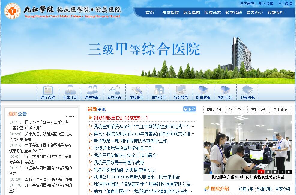 九江学院临床医学院/附属医院始建于1877年,前身是法籍天主教神父董若望创建的“圣味增爵医院”,为江西省第一所西医院,西医由此传入九江。现已发展成为拥有完善的基础设施和雄厚的医疗技术服务水平、学科设置齐全、师资力量雄厚、人才资源丰富的江西省三级甲等综合医院。作为本科大学的附属医院,在学科建设、技术水平、教学科研和人才方面具有突出优势,它功能完善、环境优美、设施完备、管理规范、技术精湛、服务优质、文化内涵深厚。医院具备一批省内、九江地区具有特色和影响的专业和科室,以及专业的技术团队和人才。医院座落于九江市中心,历来是赣北地区医疗保健中心、教研中心,担负着赣、鄂、皖三省毗邻地区近500万人口的医疗、保健服务的任务。医院设有教学区、东院区、西院区、口腔医院和濂溪大道新院区,形成“一院五区”的发展格局,总占地面积约250亩。为拓展发展空间,医院正进一步切实做好布局规划,面积达6万平方米的东院区新门诊综合大楼即将完工,濂溪大道150亩新院区也已列入九江市政府工作报告,正在规划筹建之中。医院目前设有临床及医技科室56个,编制床位1450张,在岗员工1958名。现有教授、主任医师60人,副教授、副主任医师162人,讲师、主治医师403人,博士、硕士总计297人。多个学科均拥有由博士等组成的强大的专业技术力量。医院拥有美国GE 256排512层超高端螺旋CT及多台高端螺旋CT、瑞典ELEKTA容积旋转调强医用直线加速器、美国GE 3.0T磁共振(MRI)、德国SIEMENS医用平板数字血管造影机(DSA)、美国贝克曼全自动生化分析检测流水线等一系列高精尖设备,医疗装备综合水平先进。九江学院附属医院是培养优秀医学人才的摇篮,具有严谨治学的传统与学用并举的教学特色。附院学子遍及全国乃至世界各地,其中许多人成长为国家著名医学专家。作为国家级住院医师规范化培训基地、国家级全科医生培训基地,是集全科医生培训、医学生实践教学、住院医师规范化培训、其它继续教育培训多位一体的现代化临床技能综合培训中心。临床医学院开办了临床医学、口腔、检验等多个本科专业,在校临床学生2000余人,完成不同专业、不同层次的临床学生、外籍留学生的临床见习及实习带教工作。依托教学资源优势,附属医院始终以科技为先导,科研水平不断提高。近年,获国家自然科学基金项目多项;承担国家863计划;众多国家级继续医学教育项目开班;多个学科入选江西省临床重点专科和省市共建重点学科。“建名科、铸名院”是附院一贯的发展思路和目标。如今,在学科建设方面,医院学科门类齐全,一批重点突出、特色鲜明的学科群已趋完善。医院拥有国际唇腭裂治疗基地、国家卫计委内镜专业技术消化科培训基地、享誉赣鄂皖地区的皮肤性病及医学美容科、大型的血液透析室、九江市视光学诊疗室、青光眼实验室、妇产科联合诊疗科、耳鼻咽喉科学研究室、急救分中心等。骨科是全省领先学科,消化内科、护理部是省重点学科,急诊、口腔内科、口腔正畸、病理科、检验科、重症医学科是省市共建学科,神经内科、消化内科、骨科、急诊科、病理科、病案科、口腔医院也是九江市各专业质控中心。九江学院附属医院是九江市“光明·微笑”工程白内障病人定点医院和唇腭裂病人定点医院、中西部儿童口腔疾病综合干预项目(窝沟封闭)定点医院、江西省尿毒症患者免费血透定点医院、江西省儿童先天性心脏病免费治定点医院、江西省妇女“两癌”免费救治定点医院,全心全意为人民健康服务,赢得了老百姓的赞誉,得到了社会各界的肯定。百年传承,院古人新;医海浩瀚,百舸争流。站在新的起点,九江学院附属医院秉持“以人为本”的管理理念和“以病人为中心”的服务宗旨,按照一流的管理、一流的技术、一流的设备、一流的环境、一流的服务“五个一”的要求,朝着建设全省一流的三级甲等综合型教学医院的目标,争创地区学科前沿,护航一方百姓健康。全院职工在医院党委行政的坚强领导下,正以全力赶超的精神状态,攻坚克难的坚强意志,真抓实干的工作作风,加快临床医学院、附属医院发展步伐,朝着建设“赣北明珠,长江中下游一流的全国区域性优质医院”,建设一流的本科大学附属医院的奋斗目标奋勇前进!