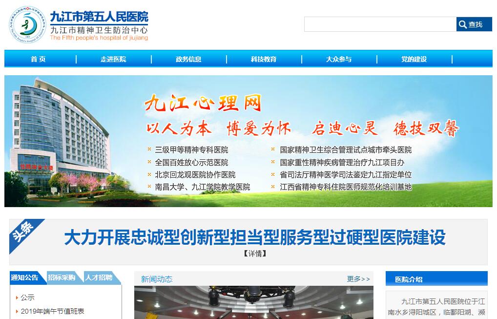 九江市第五人民医院位于江南水乡浔阳城区,临鄱阳湖、濒长江、倚庐山,占地3.5万㎡,绿化面积达70.6%,是一所环境优雅的人文生态医院。1957年建院、历经58年的发展壮大,现已成为集医疗、预防、教学、科研为一体,辐射赣、鄂、皖、湘周边地区服务人口达千万的精神卫生、心理卫生和老年康复中心。2009年,江西省卫生厅授予三级甲等精神专科医院。医院为江西省精神科住院医师规范化培训基地,南昌大学、九江学院教学医院和硕士生教学点,九江学院精神病学教研室设在该院。现有职工428人,其中卫生技术人员343人,医疗专业中高级职称人员占医师总数的60%,有兼职教授、副教授30余名,市专业技术拔尖人才、名医、中青年知名医学专家、省市级学科带头人、硕士生导师多名。医院开设精神科门诊、心理门诊、社区门诊及七个住院病区,编制床位500张,实际开放床位750张,主要收治重性精神病人、精神病康复期病人、神经症病人、儿童精神病人、戒酒戒毒病人、器质性精神障碍病人、老年痴呆病人、老年慢性病康复病人等。医院开展了一系列精神心理卫生诊断治疗新技术,如电脑成套心理测评、智力测评、智能脑电地形图、经颅多普勒检查、生物反馈治疗、催眠疗法、森田疗法、行为治疗、认知治疗、家庭心理治疗、儿童感觉统合训练,在省内率先引进进口A620脑功能诊断治疗仪、多参数监护无抽搐电休克、经颅磁治疗、血药浓度分析、心理测验等具有国内水平的诊断治疗技术。2015年,九江被国家列为江西省唯一的精神卫生综合管理试点城市,市精神卫生防治中心挂靠医院,具体负责全市精神卫生工作技术指导。