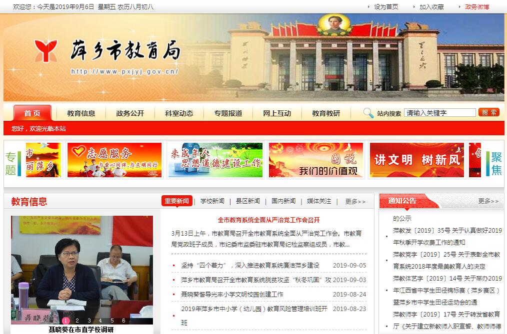 萍乡市教育局,是萍乡市一个政府机构。其主要职责是:(1)综合协调并办理局机关的重要政务和事务;负责对全市教育改革与发展的重大问题进行政策性调研,起草教育法规和规章草案及重要文稿;(2)负责教育法律、法规的宣传和咨询、市级教育行政行为引起的行政复议和处罚引起的听证,并代表市教育局进行行政诉讼工作。⑶统筹规划、协调指导我市的教育体制改革,理顺教育内部和外部的关系,建立与社会主义市场经济体制相适应的教育体制及运行机制。⑷统筹管理本部门教育经费;参与拟定筹措教育经费、教育基建投资的政策和规划,监督测评全市教育经费的筹措和使用管理情况;按有关规定管理国外和香港特别行政区及台湾地区对我市的教育援助和教育贷款。⑸统筹管理全市的基础教育、中初等职业教育、成人中初等教育;组织指导高中阶段及其以下的教育教学改革;组织对普及九年义务教育、扫除青壮年文盲、发展高中阶段教育工作的督导和评估。⑹负责对全市社会力量办学进行指导、宏观管理、监督检查和评估工作。⑺主管全市学校的教师工作。负责全市教师资格的认定和管理、教育系统的表彰奖励工作;在市继续教育主管部门的统一规划下,组织指导教育系统在职人员的继续教育工作;指导并协调学校开展人事和分配制度改革,统筹规划并指导全市各级各类教师教育管理人员队伍建设工作。⑻统筹管理全市各级各类学历教育及考试工作,负责小学和中学阶段的学籍管理工作。⑼指导全市各级各类学校的思想政治、品德教育、体育卫生与艺术教育、安全教育及国防教育等工作。⑽负责管理全市教育系统对外交流工作和国际合作工作;负责管理出国留学及外国文教专家工作;负责同香港、澳门特别行政区及台湾地区的教育交流与合作。