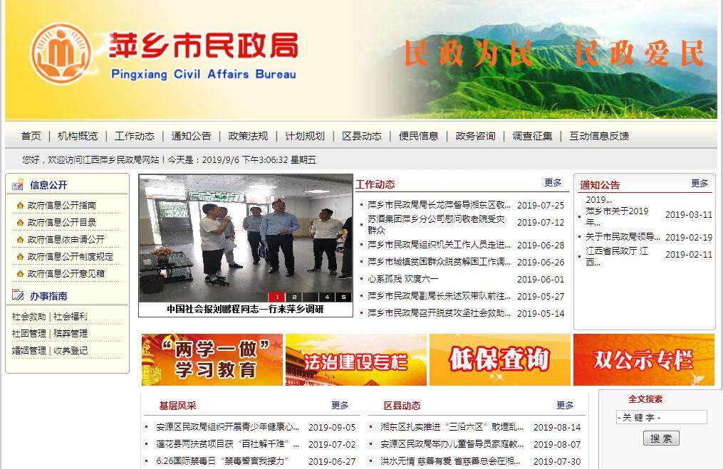萍乡市民政局主要职责:(一)在全市经济社会发展总体规划的框架内,拟订全市民政、扶贫事业发展规划以及政策规章,并组织实施和监督检查。(二)拟订全市社会救助规划、政策和标准,健全城乡社会救助体系;组织实施全市城乡居民最低生活保障、医疗救助、五保供养、临时救助;承担居民家庭经济状况核对管理工作。(三)承担依法对社会团体、基金会、民办非企业单位进行登记管理和监察责任。(四)负责各类优抚对象的抚恤、优待、补助和国家机关工作人员伤亡抚恤工作;承办革命烈士的审核报批手续;褒扬革命烈士;负责革命伤残人员伤残等级评定的审核报批和伤残器械的配置。承担萍乡市拥军优属、拥政爱民工作领导小组的有关具体工作。(五)会同有关部门拟订全市退役士兵、复员干部安置政策和计划并组织实施,指导军供站正规化建设和管理。按规定做好全市军队离退休干部、军队无军籍退休退职职工的接收安置和服务管理工作。(六)负责组织、协调救灾工作,组织自然灾害救助应急体系建设;负责灾情的核查、统计、上报和发布工作;管理、分配救灾款物并监督使用;组织、指导救灾捐赠;承担萍乡市减灾委员会的具体工作。(七)拟订全市城乡基层群众自治建设和社区建设政策,指导社区服务体系建设,提出加强和改进城乡基层政权建设的建议,推动基层民主政治建设。(八)拟订全市行政区划管理政策和行政区域界线、地名管理办法;负责县(区)、乡(镇)行政区域的设立、命名、变更和政府驻地迁移的审核工作;组织实施县乡级行政区域界线的勘定和管理工作;负责重要自然地理实体命名、更名的审核。(九)拟订全市社会福利事业发展规划、政策、标准和社会福利机构管理办法,按职责负责福利彩票管理工作;组织拟订促进慈善事业的政策,组织、指导社会捐助工作;指导老年人、孤儿和残疾人等特殊群体权益保障工作。(十)拟订全市婚姻管理、儿童收养和殡葬管理政策,负责推进婚俗和殡葬改革,指导婚姻、收养、殡葬、救助服务机构管理工作。(十一)会同有关部门按规定拟订全市社会工作发展规划、政策和职业规范,推进社会工作人才队伍建设和相关志愿者队伍建设。(十二)拟订全市老龄事业中长期规划及政策;协调和推动有关部门做好维护老年人权益工作;推动开展老年人身心健康的各种活动;检查督促县(区)老龄工作。(十三)拟订全市老区建设、贫困地区扶贫开发年度工作计划并组织实施;会同有关部门编制全市水库移民后期扶持规划和年度项目计划并组织实施;按权限审核全市深山区移民、灾后移民、工程移民和新建大中型水库(水电站)移民等各种移民安置规划。(十四)负责全市扶贫开发、老区建设和水库移民项目的管理,会同有关部门对全市扶贫开发、老区建设和水库移民项目的实施情况进行监督检查;负责全市扶贫开发、老区建设和水库移民统计监测工作。(十五)参与制定全市民政、扶贫开发、老区建设和移民资金使用管理办法;负责全市民政、扶贫资金分配;按规定会同有关部门管理使用水库移民资金;指导全市基层民政、扶贫和移民机构的财务会计工作;会同有关部门对全市民政、扶贫开发、老区建设和水库移民资金使用情况进行稽查审计和监督、检查。(十六)指导全市老区、贫困地区开展有关扶贫方面的横向经济协作、招商引资工作;组织党政机关和社会各界开展定点扶贫和对口帮扶工作。(十七)协助贫困地区开展对外联络;争取并按规定接受境外政府和非政府组织的援助;负责外资扶贫款项的引进、管理和监督检查工作;负责老区、贫困地区科技扶贫的培训、示范、推广工作;组织开展移民的生产技术培训工作。(十八)承办市人民政府交办的其他事项。