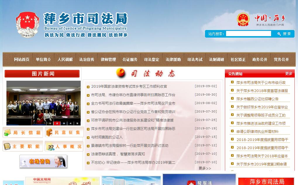 萍乡市司法局重建于1980年11月,是市政府主管司法行政工作的职能部门。其主要职能有:(一)承担全面依法治市重大问题的政策研究,协调有关方面提出全面依法治市中长期规划建议,负责有关重大决策部署督察工作。(二)承担统筹规划立法工作的责任。协调有关方面提出立法规划和年度立法工作计划的建议,负责跟踪了解各部门对立法工作计划的落实情况,加强组织协调和督促指导,研究提出立法与改革决策相衔接的意见、措施。负责面向社会征集地方性法规和市政府规章制定项目建议。(三)负责起草或组织起草有关地方性法规、规章草案。承办各部门报送市政府的地方性法规、规章草案的审查工作。负责立法协调。(四)承办市政府规章的解释,立法后评估工作。负责协调各地各部门实施法律法规规章中的有关争议和问题。承办市政府规章清理、编纂工作。负责组织翻译、审定市政府规章外文文本。承担市政府规章报送备案工作。承办县(区)政府和市政府各部门规范性文件备案审查工作。(五)承担统筹推进法治政府建设的责任。指导、监督市政府各部门、各级政府依法行政工作。负责综合协调行政执法,负责推进行政执法体制改革等有关工作,推进严格规范公正文明执法。负责市政府行政复议和应诉案件办理、指导工作,指导、监督全市行政复议和行政应诉工作。(六)承担统筹规划法治社会建设的责任。负责拟订法治宣传教育规划,组织实施普法宣传工作,组织对外法治宣传。推动人民参与和促进法治建设。指导依法治理和法治创建工作。指导调解工作和人民陪审员、人民监督员选任管理工作,推进司法所建设。(七)指导、管理社区矫正工作。指导刑满释放人员帮教安置工作。(八)负责拟定公共法律服务体系建设规划并指导实施,统筹和布局城乡法律服务资源。指导、监督律师、法律援助、司法鉴定、公证、仲裁和基层法律服务管理工作。组织开展法治对外合作交流。承办涉港澳台的法律事务。(九)承办国家统一法律职业资格考试的组织实施工作。承办国家统一法律职业资格证书申请材料的初审报批和证书的发放工作。负责指导、协调法律职业人员入职前培训工作。(十)指导、监督本系统财务、装备、设施、场所等保障工作。落实局机关环境保护职责。(十一)规划、协调、指导法治人才队伍建设相关工作,指导、监督本系统队伍建设。协助县(区)管理司法局领导干部。十二)完成市委和市政府交办的其他任务。