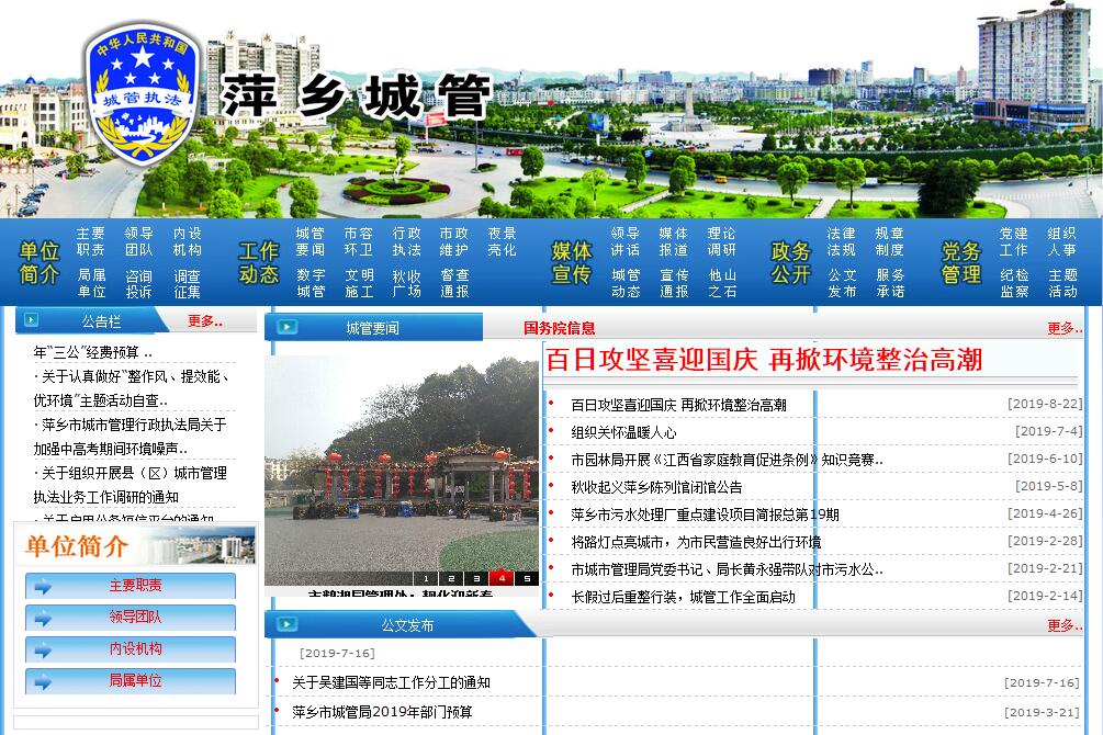 萍乡市城市管理局成立于2007年3月,为市政府工作部门,正县级。其主要职责是:1.贯彻执行城市管理、城市管理行政执法的方针、政策和法律、法规,起草有关政策性、规范性文件,编制城市管理工作发展战略总体规划、中长期发展规划、专项规划和年度计划,拟订相关管理标准,制定城市管理工作规范和行政执法行为规范。2.负责全市城市管理和行政执法的统筹协调、组织调度和监督考核,组织指导或实施跨区域执法;负责组织城市管理和行政执法业务培训和综合考核;负责城市管理普法教育和宣传。3.负责全市市容环境卫生管理。负责组织、指导、监督、协调全市市容环境卫生综合整治;负责编报环卫设施投资计划并监督实施;负责督导、监督、考评、考核城市规划区的清扫保洁、道路冲洗、洒水降尘,生活垃圾的收集、运输和处置;负责生活垃圾的减量化、资源化、无害化工作,指导垃圾分类工作;负责生活垃圾处理设施的运营监管;参与城市规划区内环卫设施的规划、建设和竣工验收。负责农村生活垃圾治理的业务指导和监督管理。4.负责全市市政公用设施运行管理。负责城市规划区内主次干道及桥梁、涵洞、排水管网等附属设施的建设、维修和管理;负责完善过街设施,合理设置人行天桥、地下通道和安全岛等;负责对占用、挖掘城市规划区内公共场地的审批;负责城市规划区停车场所、洗车场所的设置、审批和监管;负责公共自行车的设置和监管;参与城市规划区主次干道及其附属设施新建工程项目的图纸审查及竣工验收;负责城市规划区内城市功能照明和景观照明设施的建设、管理、维修和养护。5.负责全市城市园林绿化管理。负责对城市规划区主次干道绿化带、公共绿地及公园、广场的监管;负责中心城区内砍伐、移植树木、占用绿地的审批;督促、指导拆墙透绿工作的实施。6.负责全市城市供水、排水工作。负责城市供水、污水处理及中水回用工作,指导乡镇城市供水、污水处理工作。7.负责城市规划区摊点疏导区和夜宵市场的规划、设置审批和监管。8.负责城市管理综合执法装备器材的列编。9.负责编制建设工地文明施工管理标准规范(现场文明施工、围墙、围挡、出入口设置),负责对城市规划区建设工地不文明施工行为的监管;负责城市规划区建筑垃圾和渣土的调剂、运输、消纳管理及处置企业的资质审批。10.负责编制户外广告专项规划和设置技术规范;负责城市规划区大型户外广告的设置审批和临街门店招牌的规范设置。11.负责对城市规划区户外公共场所无照经营行为的管理;负责城市规划区户外公共场所食品销售和餐饮摊点无证经营以及已取得经营许可但违反城市管理相关法律法规行为的监管。12.负责对向萍水河中心城区段倾倒废弃物和垃圾及违规取土、城市河道违法建筑行为的监管。13.负责推进城市管理数字化、精细化、智慧化建设。14.负责推进城市管理公共服务的市场化、专业化、产业化。15.负责城市管理突发事件的应急处理。16.负责跨区域、复杂的城市管理执法案件的综合协调、查处以及重大案件的审理。17.负责城市管理和城市管理行政执法的行政复议和行政诉讼工作。18.完成市委、市政府交办的其他任务。
