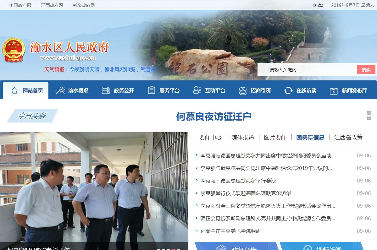 渝水区位于江西省中部偏西,新余市东部,袁河中下游,新余城区所在地。东界樟树、新干,南连峡江、吉安,西接分宜,北邻上高、高安,距省会南昌160公里。地跨北纬 27°50',东经114°58'。辖10镇6乡5个街道办事处:城北办、城南办、袁河办、仙来办、通州办、良山镇、珠珊镇、水北镇、姚圩镇、罗坊镇、下村镇、观巢镇、欧里镇、河下镇、水西镇、鹄山乡、人和乡、界水乡、南安乡、新溪乡、九龙山乡。其中观巢镇、欧里镇由孔目江生态经济区托管;河下镇、九龙山乡由仙女湖风景名胜区托管;水西镇由高新技术产业开发区托管。辖区总面积1775平方公里,户籍人口85.2万人。自然优越,物产丰富。渝水区属亚热带湿润气候,四季分明,气候温和,阳光充足,雨量充沛,无霜期长,严冬极短,土地肥沃,森林覆盖率近50%。适宜多种农作物生长,主要盛产水稻、棉花、油茶、花生、芝麻、柑桔、茶叶等。境内拥有丰富的矿产资源、水资源和生物资源。矿藏资源主要有煤、铁、金、铜、锰、钨、石灰石、硅灰石、大理石、石英石、瓷土等30多种,其中铁矿、硅灰石、大理石的储量占有一定的地位,硅灰石储量列全国第二。历史悠久,人杰地灵。渝水区前身为新余县。1983年新余复市后由原新余县改为渝水区。自三国宝鼎二年(公元267年)建县,距今已有1700余年的历史,人才辈出,群星璀璨。东晋史学家习凿齿,宋朝宰相王钦若,明代理学家梁寅,清建威将军张春发,现代著名国画家、美术教育家傅抱石,皆文韬武略,翰墨丹青,为后人所景仰。世界风云人物、著名艾滋病防治专家、美籍华人何大一为当今全球瞩目。崇文好学的渝水,基础教育长期位居全省前列,恢复高考以来哺育输送近万名英才。勤劳、勇敢、智慧的渝水人民,具有光荣的革命传统。1930年,毛泽东、朱德等老一辈革命家率红一方面军到罗坊,召开了著名的“罗坊会议”,为渝水在中国革命史册上添上了浓墨重彩。设施完善,交通便捷。渝水在发展经济的过程中,注重加强基础设施建设。交通、邮电、供电、供水、供气等基础和生活服务设施日臻完善。境内电力充足,乡乡通油路,村村通水泥路,程控电话、光缆传输网覆盖城乡各地。浙赣铁路横贯东西,上新、清萍、吉新三条省级公路纵横贯穿,东邻京九铁路,南与 105、北与 320国道相接,沪瑞、赣粤两条高速公路穿境而过,交通、通讯十分便捷,为渝水进一步大开放、大发展提供了有力保障。山川秀美,游览胜境。渝水境内自然风光与人文景观交相辉映,依山而建构造别致的抱石公园,山水交融、千姿隽异的仙女湖风景名胜区。城北郊的仰天岗森林公园环境优雅,众多名胜古迹、历史遗迹、神话传说、寺院庙宇等吸引八方游客。革命传统教育基地罗坊会议纪念馆,蒙山、百丈峰等一批生态型、休闲型观光度假基地,令人美不胜收,流连忘返。