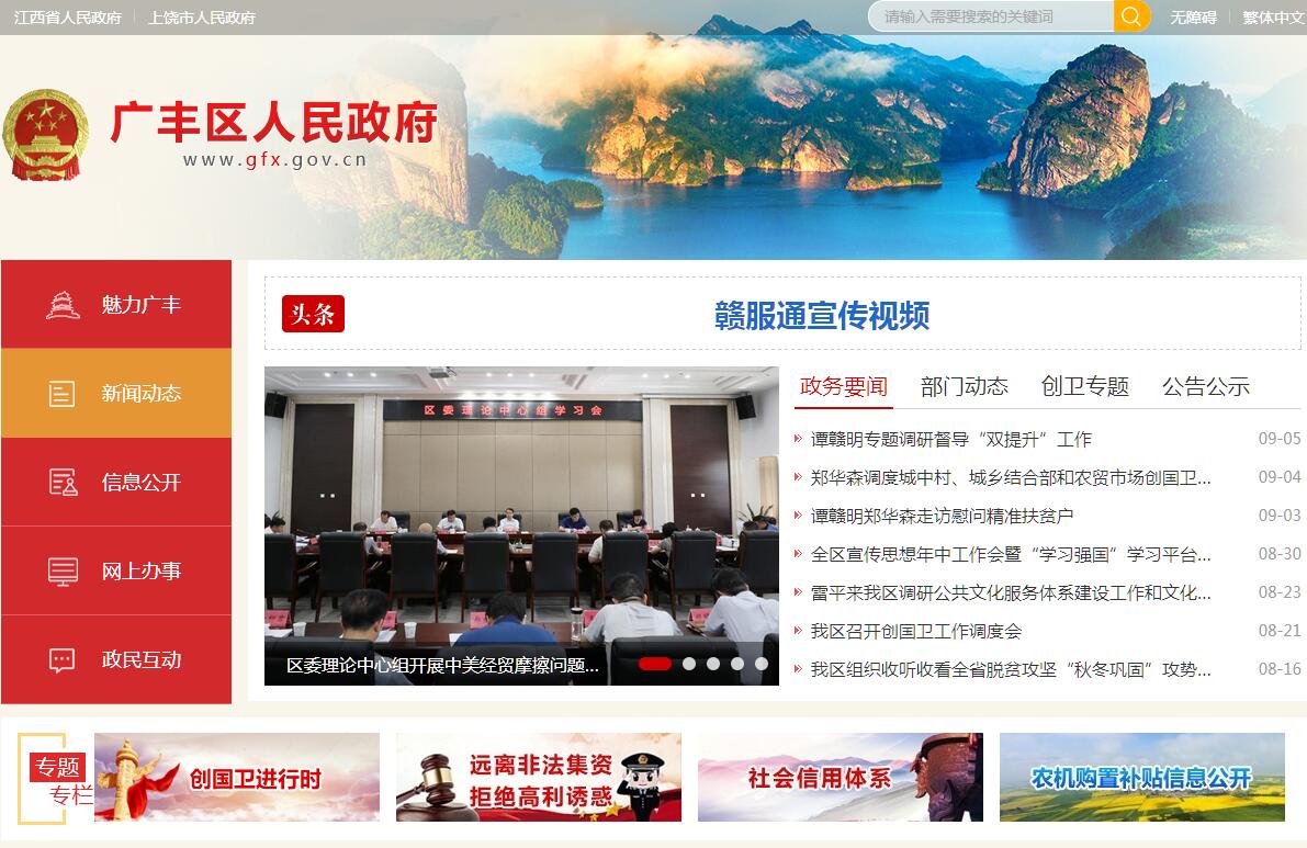 | 网站简介: 广丰区隶属江西省上饶市,位于江西省东北部,东接浙江省江山市,北邻玉山县,西毗上饶市上饶县、信州区,南接福建省浦城、崇安两县。区境南北长62.5千米,东西宽45千米。广丰始建于唐,原称永丰,清雍正十年(1732年)改称广丰。广丰区辖23个乡镇街道。广丰地处北纬28°3’30″—28°37’23’’,东经118°1′18″—118°29′15",属亚热带季风气候,年平均无霜期266天,多年平均气温17.9℃,年平均降雨量1661.6毫米。截至2013年末,广丰区人口有923766人,总面积1377.79平方千米。2012年广丰区实现生产总值(GDP)为2060030万元。广丰拥有“全国社会治安综合治理先进县”、“全国卫生县城”、“国家双拥模范县”,“全国文明县城”等称号。2015年2月16日,国务院批复同意撤销广丰县,设立上饶市广丰区,2015年6月6日,“广丰区”正式挂牌成立。 |