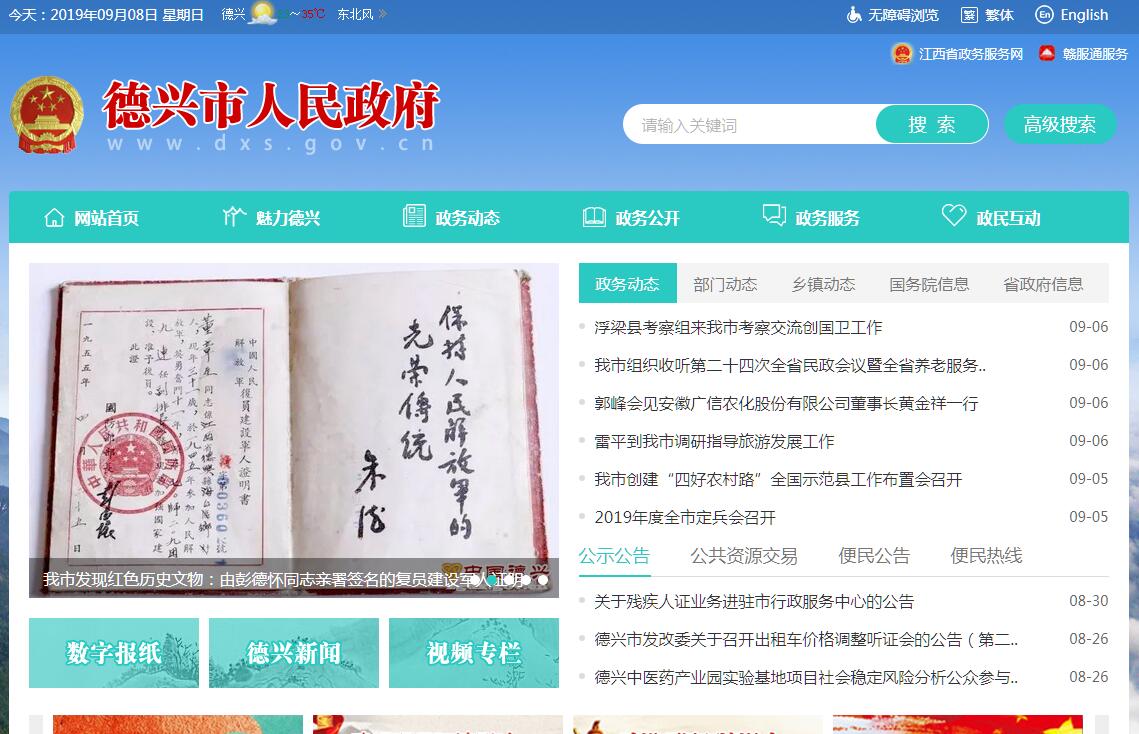 | 网站简介: 德兴市为江西省直辖,上饶市代管市(县级),位于江西省东北部,上饶市北部,赣、浙、皖三省交界处,取“山川之宝,惟德乃兴”之意而定名。截至2016年底,德兴市总面积2101平方千米,辖3个街道、5个镇、6个乡和大茅山省级经济开发区,1990年12月撤县设市。2016年,德兴市常住人口为30.02万人。东汉建安八年(公元203年)置县,在历史上,拥有进士417名,约占整个上饶进士总数的五分之一,并涌现出湿法炼铜鼻祖张潜等一大批名人。德兴是中国重要的有色金属工业基地。三清山位于市域东部,大茅山省级风景名胜区、梧风洞就在境内。曾获全国科技进步先进市等荣誉。2016年,德兴市实现生产总值126.51亿元。2019年7月,荣获2019年“中国天然氧吧”创建地区称号。 |