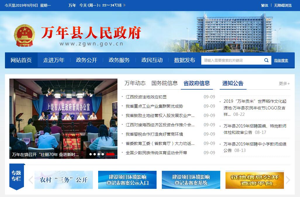 | 网站简介: 万年县,江西省上饶市下辖县,地处江西省东北部、鄱阳湖东南岸。东与弋阳交壤,西与余干毗邻,南与鹰潭市接壤,北与鄱阳、乐平相邻。地貌特征“六山一水二分田,一分道路和庄园”。万年县辖6镇6乡和2个管委会,人口43.57万(2017年),主要通行赣语。总面积1140.76平方千米。2016年,万年县地区生产总值120.58亿元,第一产业增加值13.61亿元;第二产业增加值68.07亿元;第三产业增加值38.90亿元,三次产业结构为11.3:56.4:32.3。万年县先后被授予江西省级卫生城、江西省级园林城、江西省级双拥模范县、江西省平安县和中国绿色名县、国家知识产权强县工程试点县。2019年3月6日,中央宣传部、财政部、文化和旅游部、国家文物局《中央宣传部 财政部 文化和旅游部 国家文物局关于公布《革命文物保护利用片区分县名单(第一批)》的通知》万年县名列其中。 |