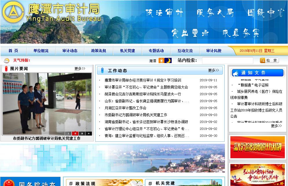 鹰潭市审计局主要职责:(一)主管全市审计工作。负责对全市财政收支和法律法规规定属于审计监督范围的财务收支的真实、合法和效益进行审计监督,对公共资金、国有资产、国有资源和领导干部履行经济责任情况实行审计全覆盖,对领导干部实行自然资源资产离任审计,对国家、省、市有关重大政策措施贯彻落实情况进行跟踪审计。对审计、专项审计调查和核查社会审计机构相关审计报告的结果承担责任,并负有督促被审计单位整改的责任。(二)制定并组织实施全市专业领域审计工作规划。对直接审计、调查和核查的事项依法进行审计评价,作出审计决定或提出审计建议。(三)向市委审计委员会提出年度市级预算执行和其他财政支出情况审计报告。向市长提出年度市级预算执行和其他财政收支情况的审计结果报告。受市政府委托向市人大常委会提出市级预算执行和其他财政收支情况的审计工作报告、审计查出问题整改情况报告。向市委和市政府报告对其他事项的审计和专项审计调查情况及结果。依法向社会公布审计结果。向市委和市级国家机关有关部门、区(市)党委和政府通报审计情况和审计结果。(四)直接审计下列事项,出具审计报告,在法定职权范围内作出审计决定,包括:1.国家、省、市有关重大政策措施贯彻落实情况;2.市级预算执行情况和其他财政收支,市本级各部门(含直属单位)预算执行情况、决算草案和其他财政收支;3.区(市)政府预算执行情况、决算草案和其他财政收支,中央、省、市级财政转移支付资金;4.使用市财政资金的事业单位和社会团体的财务收支;5.市政府投资和以市政府投资为主的建设项目的预算执行情况和决算,市级重大公共工程项目的资金管理使用和建设运营情况;6.全市自然资源管理、污染防治和生态保护与修复情况;7.市属国有企业和金融机构、市属国有资本占控股或主导地位的企业和金融机构境内外资产、负债和损益,市政府驻外非经营性机构的财务收支;8.有关社会保障基金、社会捐赠资金和其他基金、资金的财务收支;9.国际组织和外国政府援助、贷款项目;10.参与审计署、省审计厅统一组织的审计事项;11.法律法规规定的其他事项。(五)按规定对县处级党政主要领导干部及其他单位主要负责人实施经济责任审计和自然资源资产离任审计。(六)组织实施对国家财经法律法规、规章、政策和宏观调控措施执行情况、财政预算管理及国有资产管理使用等与国家财政收支有关的特定事项进行专项审计调查。(七)依法检查审计决定执行情况,督促整改审计查出的问题,依法办理被审计单位对审计决定提请行政复议、行政诉讼或市政府裁决中的有关事项,协助配合有关部门查处相关重大案件。(八)指导和监督内部审计工作,核查社会审计机构对依法属于审计监督对象的单位出具的相关审计报告。(九)与区(市)党委和政府共同领导区(市)审计机关,依法领导和监督区(市)审计机关的业务,组织区(市)审计机关实施特定项目的专项审计或审计调查,纠正或责成纠正区(市)审计机关违反国家规定作出的审计决定。按照干部管理权限协管区(市)审计机关负责人。(十)参与审计领域的国际交流与合作,指导和推广信息技术在全市审计领域的应用。(十一)完成市委、市政府和省审计厅交办的其他任务。