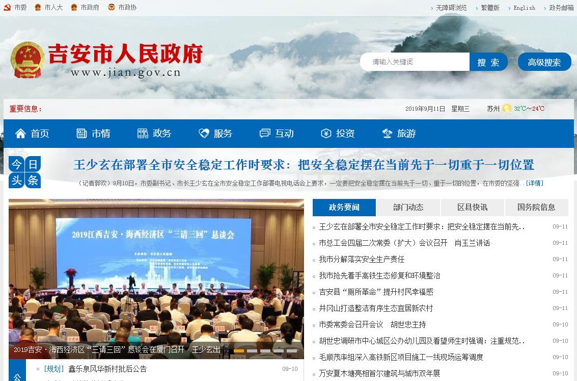 吉安位于江西省中西部,是举世闻名的革命摇篮井冈山所在地。古称庐陵、吉州, 元皇庆元年(1312)取吉阳、安成首字合称为吉安。2000年5月撤地设市,现辖2区10县1市(即吉州区、青原区,吉安县、新干县、永丰县、峡江县、吉水县、泰和县、万安县、遂川县、安福县、永新县,井冈山市),面积2.53万平方公里,截止到2018年底末人口538.99万。先后获中国优秀旅游城市、全国双拥模范城市、国家森林城市、国家园林城市、全国绿化模范城市、全国电子信息产业科技兴贸创新城市、全国新型工业化(电子信息)产业示范基地城市、外商投资最佳城市、全国文明城市提名城市、国家卫生城市、省级文明城市、省级卫生城市、江西省首届生态宜居城市等荣誉称号。吉安自古人杰地灵,文化发达,民风淳厚,素有“江南望郡”“金庐陵”之称,更有“文章节义之邦”美誉。这里孕育了以“追求一流、坚守气节”为精髓,以“放眼天下、崇文重教、传扬家风、团结拼搏、忠义报国”为行为特质的庐陵文化,从唐宋至明清,吉安科举进士近3000名,状元、榜眼、探花52位(状元17位),曾经出现过“隔河两宰相,五里三状元”的历史盛事。“唐宋八大家”之一欧阳修、民族英雄文天祥、《永乐大典》 主纂解缙、宋代大文豪杨万里等一批历史文化名人先后诞生在这里,被誉为“人文故郡”。这里创造出伟大的“井冈山精神”,1927年,毛泽东、朱德等老一辈无产阶级革命家在这里创建了第一个农村革命根据地,点燃了中国革命的“星星之火”,锻造了“坚定执着追理想、实事求是闯新路、艰苦奋斗攻难关、依靠群众求胜利”的井冈山精神,被誉为“红色摇篮”。这里位处香港、广东经江西到中原的核心地带,既是沿海腹地,又是内地前沿,北与长江三角洲对接,东与闽江三角洲毗邻,南与华南经济圈呼应,是至关重要的“黄金走廊”。境内井冈山机场己开通至北京、上海、深圳、厦门、成都、广州、西安、天津、海口、南京、南宁、南昌等12个城市的航班;南北向有京九铁路,东西向有沟通京九、京广两条铁路大动脉的衡茶吉铁路,开通了到北京、上海、深圳、厦门、南昌的始发列车,昌吉赣客运专线全面开工建设,吉安正加快进入“高铁新时代”;赣江航道贯穿境内,成为便捷的货运黄金水道;赣粤高速、泰井高速、武吉高速以及吉莲高速、抚吉高速、井睦高速公路相继建成通车,是目前江西第二大陆地交通枢纽,连接长三角、珠三角和闽东南的重要节点,未来的中部“交通城”。全市耕地总资源443957.56公顷;基本农田保护面积365906.6公顷;地表水资源232.89亿立方米,可开发水能资源157万千瓦,全省最大的水力发电厂万安水电厂就在吉安;全市森林覆盖率达67.61%,有3513余种植物和268种陆生野生动物,是国内杉木、湿地松、毛竹、油茶等经济林的重要生产基地;矿产资源种类齐全,发现矿产55种,占全省发现矿产种数的33%,其中探明储量的28种;境内山青水秀,生态优美,空气质量常年保持在国家二类标准以上,被誉为“绿色家园”,“红、绿、古”三色旅游资源十分丰富,“全景吉安、全域旅游”战略正在实施。井冈山被誉为“天下第一山”,属首批国家级风景名胜区,是全国旅游胜地四十佳和中国优秀旅游城市;境内还有武功山、青原山、玉笥山、白水仙等4 个省级风景名胜区,有当今世界保存最完好、保留遗址规模最大且最集中的窑址群吉州窑,以及白鹭洲书院、新干商墓遗址、永丰西阳宫等一大批人文古迹。井冈山大学作为吉安最高学府,拥有近2万人的办学规模,校园占地面积2440亩,校舍建筑面积57万多平方米,教学科研设备总值2.1亿多元,图书190余万册,成为培养高素质人才的重要基地。有高职院校——吉安职业技术学院1所,拥有教学设备价值达5600万余元,图书资料20万多册,校内外实训室(中心)和实践基地215个,已开设专业12个;有全日制普通中专、职业高中和技工学校38所,实验实训设备总值1.2亿元,共开设专业66个,其中省级精品专业17个,每年可向社会提供10余万具有中等以上文化劳动力。有普通中学306所,每年为全国各大中专院校输送优秀人才2万余人;小学735所,教学点1123个;幼儿园1683所;特殊教育学校10所。境内公路通车里程达22879千米,其中高速公路632千米,形成市至县“一小时交通圈”。全市建成以500千伏变电站为骨架,220、110千伏变电站为主体的输变电网络,以华能井冈山电厂、万安水电厂、峡江水利枢纽、石虎塘航电枢纽为骨干的电力,装机总容量达245.3万千瓦,其中华能井冈山电厂、万安水电厂、峡江水利枢纽年发电量分别为89.93、14.52、11.44亿度;全市固定电话装机达47.07万户,移动电话达343.68万户,互联网用户80万户,交通、能源、通讯等基础设施日臻完善。同时,全市形成海关、商检、市长直通电话、投资洽谈中心、投诉中心、办证服务中心、招投标中心“七位一体”的投资服务体系,一个“成本低、回报快、信誉好、效率高”、开明开放的新吉安正在江西中部加速崛起。全市已形成电子信息、先进装备制造、生物医药大健康、新能源新材料、绿色食品等主导产业格局,拥有已改造升级的食品、化工、建材、轻工等传统产业和井冈蜜柚、绿色大米、有机茶叶、有机蔬菜、特色竹木、特色药材等六大特色富民产业以及茶叶、乌鸡、油茶、药材等一批本土特色产业。拥有1个国家级经济技术开发