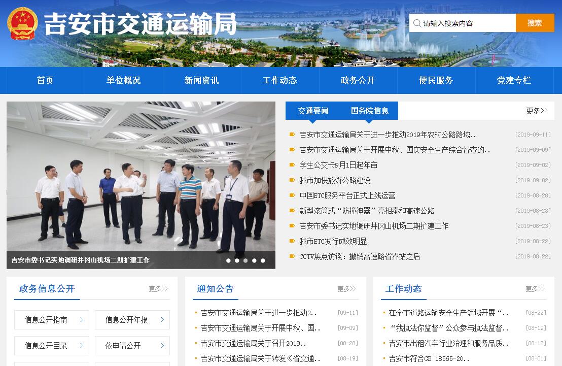 吉安市交通运输局,为市人民政府工作部门。其主要职责是:(一)贯彻执行国家有关交通运输行业的法律法规和政策,拟订有关地方性法规规章草案,在全市经济社会发展总体规划的框架内,拟订全市公路、水路等行业规划、计划并组织实施,指导公路、水路行业有关体制改革工作。(二)承担综合交通运输组织协调工作;承担公路、水路运输体系的规划协调工作,组织编制公路、水路运输体系规划、计划,指导公路、水路运输枢纽管理。(三)承担公路、水路运输市场监督管理责任。监督道路、水路旅客运输、货物运输、装卸搬运、车船维修、运输服务、营运汽车综合性能检测、机动车驾驶员培训机构和驾驶员培训行业有关政策、准入制度、技术标准和运营规范的实施,指导城乡客运及有关设施规划和管理工作,负责汽车运输、河流运输有关管理工作。(四)负责提出公路、水路固定资产投资规模和方向、市财政性资金安排意见,按市政府规定权限审批、核准全市规划内和年度计划规模内固定资产投资项目。(五)承担公路、水路建设市场监管责任。监督公路、水路工程建设相关政策、制度和技术标准的实施,组织协调农村公路、改渡建桥、危桥改造、港口码头、客运站亭等农村交通基础设施建设,组织协调公路、水路有关重点工程建设和工程质量监督管理工作,指导交通运输基础设施管理和维护,承担有关重要设施的管理和维护,按规定负责港口规划和岸线使用管理工作。(六)指导公路、水路行业安全生产和应急管理工作。负责道路和水路运输企业、交通工程建设安全生产监督管理及乡镇渡口安全监督,按规定组织协调重点物资运输和紧急客货运输,负责高速公路及重点干线路网运行监测协调,承担国防动员有关工作。(七)组织交通基础设施建设资金的筹集使用和管理,管理局机关和局属单位国有资产,指导交通系统内部审计工作。(八)指导交通运输信息化建设,监测分析运行情况,开展交通运输行业统计工作,发布有关信息。指导公路、水路行业环境保护和节能减排工作。(九)承办市政府交办的其他工作。