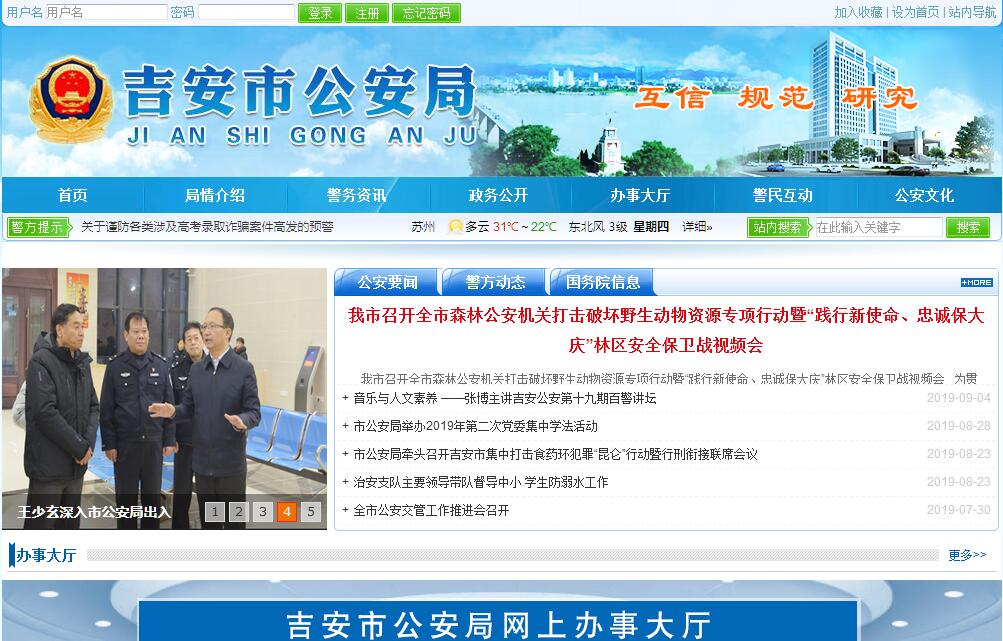吉安市公安局主要职责:(一)贯彻执行国家的法律、法规和公安工作的路线、方针、政策;研究拟订有关公安工作的规定和实施办法;对全市公安机关实施组织领导和指挥;负责对全市公安工作的部署、指导、检查和监督;同时具有实战单位的职能。(二)掌握影响稳定、危害国内安全和社会治安情况,分析形势,制定对策。(三)组织实施并指导侦查工作,组织、协调处置重大案件、治安事件、治安事故和骚乱。(四)组织实施并指导全市公安机关依法查处危害社会治安秩序行为,依法管理户籍和门牌、流动人口、居民身份证和居民身份号码、危险物品和特种行业等工作。(五)组织指导出(入)境和外国人在我市境内居留、旅行的有关管理工作,组织指导全市公安外事工作。(六)组织实施并指导、监督全市消防和警卫工作。(七)组织实施并指导全市公安机关维护道路交通安全,交通秩序以及车辆、驾驶员管理工作。(八)指导、监督全市公安机关对国家机关、社会团体、企事业单位和重点建设工程的治安保卫工作以及群众性治安组织的治安防范工作;指导机关、企事业单位保卫组织和经济民警、保安队伍的建设。(九)组织实施并指导、监督全市公共信息网络安全监察工作。(十)指导、监督全市公安机关依法承担的执行刑罚和监督、考察工作;组织实施并指导、监督看守所、拘役所、治安拘留所、强制戒毒所、收容教育所等的管理工作,规划和指导全市监所建设。(十一)组织实施并指导全市公安法制建设;指导、检查、监督公安机关执法活动。(十二)指导、监督全市公安机关收容教养审批工作以及承办市劳动教养委员会审批办公室的日常工作。(十三)组织实施并指导全市公安机关开展禁毒和缉毒工作以及承办市禁毒领导小组办公室的日常工作。(十四)组织全市公安科学技术工作,规划公安信息技术、刑事技术和行动技术建设。(十五)规划制定全市公安机关装备、被装配备和经费等警务保障标准、制度。(十六)领导全市公安消防、警卫部队建设;对武警支队执行公安任务及相关业务建设实施领导和指挥。(十七)指导全市公安政治工作和队伍建设;组织实施并指导、管理全市公安教育、培训及技能训练;组织指导公安宣传工作;按规定权限管理干部人事工作。(十八)制定全市公安队伍监督管理工作规章制度,分析队伍状况,组织实施并指导全市公安机关督察工作;按规定权限实施对干部的监督;查处或督办公安队伍重大和较大违纪案件。(十九)市森林公安局列入市公安局序列,受主管部门和市公安局双重领导;市森林公安局为市公安局负责组织、指导查处森林刑事和治安案件的职能部门,业务工作以市公安局领导为主。(二十)配合海关缉私警察依法履行职责。(二十一)承办市委、市政府、省公安厅交办的其他工作。
