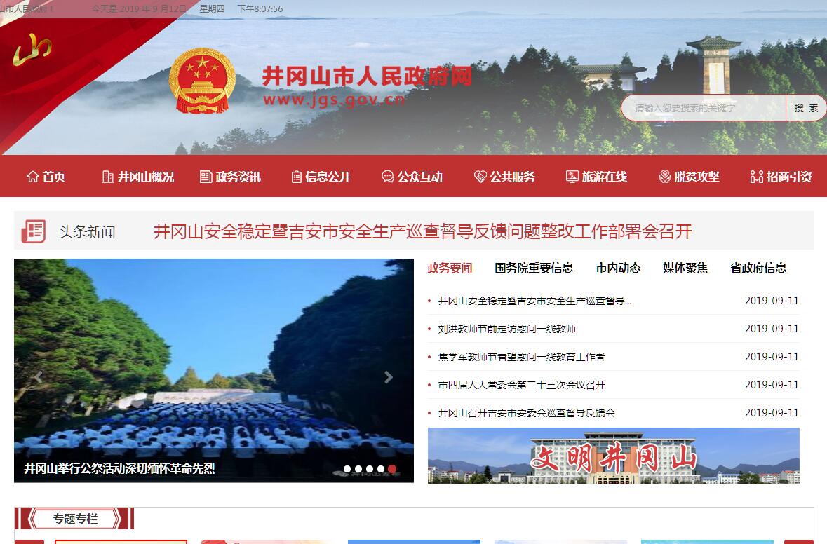 井冈山,位于江西省西南部,地处湘赣两省交界的罗霄山脉中段,古有“郴衡湘赣之交,千里罗霄之腹”之称。建国后,在党中央、国务院的亲切关怀下,于1950年设立井冈山特别区,1959年成立省辖井冈山管理局,1981年撤局设县,1984年撤县设市,2000年5月,原井冈山市与原宁冈县合并组建新的井冈山市。2005年7月,成立井冈山管理局。井冈山市辖21个乡镇场、街道办事处、106个村民委员会。现有人口16.3万人,国土面积1297.5平方公里,其中耕地15.26万亩,林地168万亩。井冈山,革命历史辉煌,自然风光绚烂,红绿辉映,融为一体,是全国著名的革命圣地和5A级旅游景区。井冈山,以其辉煌灿烂的革命历史,铸就了蜚声中外的“红色摇篮”。上世纪二十年代末,毛泽东、朱德等老一辈无产阶级革命家率领中国工农红军来到这里开展了艰苦卓绝的井冈山斗争,创建了中国第一个农村革命根据地,点燃了中国革命的星星之火,开辟了“农村包围城市,武装夺取政权”具有中国特色的革命道路,中国革命从这里走向胜利;孕育了伟大的井冈山精神,激励无数英雄儿女前赴后继。从此,鲜为人知的井冈山被载入中国革命历史的光辉史册,被誉为“中国革命的摇篮”和“中华人民共和国的奠基石”。井冈山,以其绚丽多姿的自然风光,被世人赞叹为“绿色宝库”。大自然的鬼斧神工,使井冈山享有“天然动植物园”的美誉。这里千峰竞秀,万壑争流,苍茫林海,飞瀑流泉,融雄、险、幽、奇、秀为一体。春天,群山叠翠,郁郁葱葱,杜鹃花开,艳丽多姿,尽显秀美景色;夏天,山高气温低,林茂而风起,故盛夏虽热而无酷暑;秋天,满目黄杉红枫,漫山遍野,层林尽染,宛如一幅色彩斑斓的图画;冬天,银装素裹,冰晶似玉,一派北国风光。井冈山森林覆盖率达到86%以上,这里环境优美,空气清新,每立方厘米空气中含负氧离子数超过80000个,人称“天然氧吧”,是理想的旅游避暑休闲疗养胜地。井冈山,以其深邃的红色文化底蕴,成为人们心中的“精神家园”。巍巍五百里井冈,100多处革命旧址遗迹散落其间,已经成为一个没有围墙的革命历史博物馆,成为人们陶冶情操、净化心灵、提升境界、坚定信念的生动课堂,成为进行爱国主义教育和革命传统教育的重要基地。近年来,井冈山先后获得了国家5A级旅游景区、全国文明风景旅游区、国家卫生城、全国园林绿化先进城市、全国造林绿化百佳县(市)、全国社会治安综合治理先进单位、全国征兵工作先进单位、全国体育先进市、全国创建文明城市工作先进城市、全国双拥模范城、国家生态文明建设示范市、全国四好农村路示范县等国家级荣誉称号。