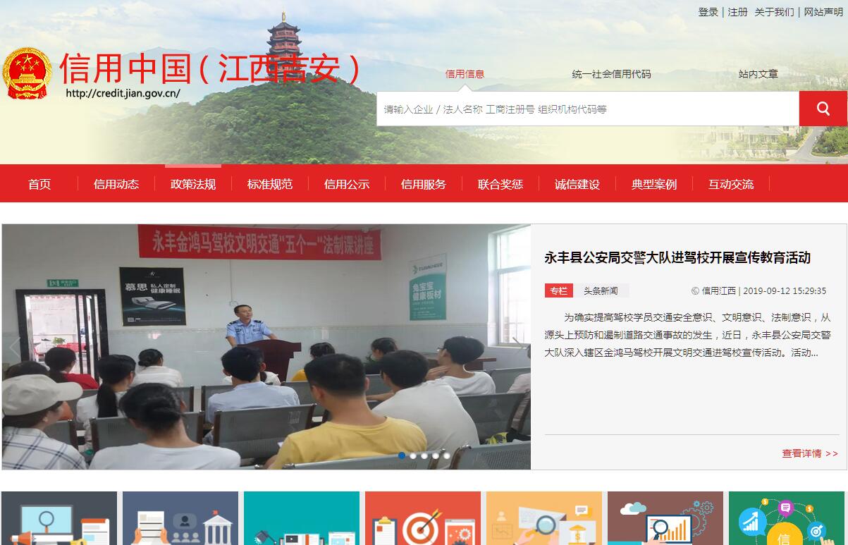 | 网站简介: “信用中国(江西吉安)”网站(http://credit.jian.gov.cn)是吉安市发展和改革委员会主办的吉安公共信用信息统一对外发布、接受外部查询等的平台。网站按照统一的标准规范,全面整合我市有关行业和部门记录的社会成员信用信息,建立企业、个人、事业单位和社会组织信用信息公共数据库,实现市级行业、部门之间信用信息的共享。“信用中国(江西吉安)”网站围绕信用信息的征集、整合、应用和监管,按照相关标准规范,征集和整合我市有关行业和部门记录的社会成员信用信息,建立企业、个人、事业单位和社会组织信用信息公共数据库,为社会公众、企业、行政部门、金融机构提供信用信息服务。 |