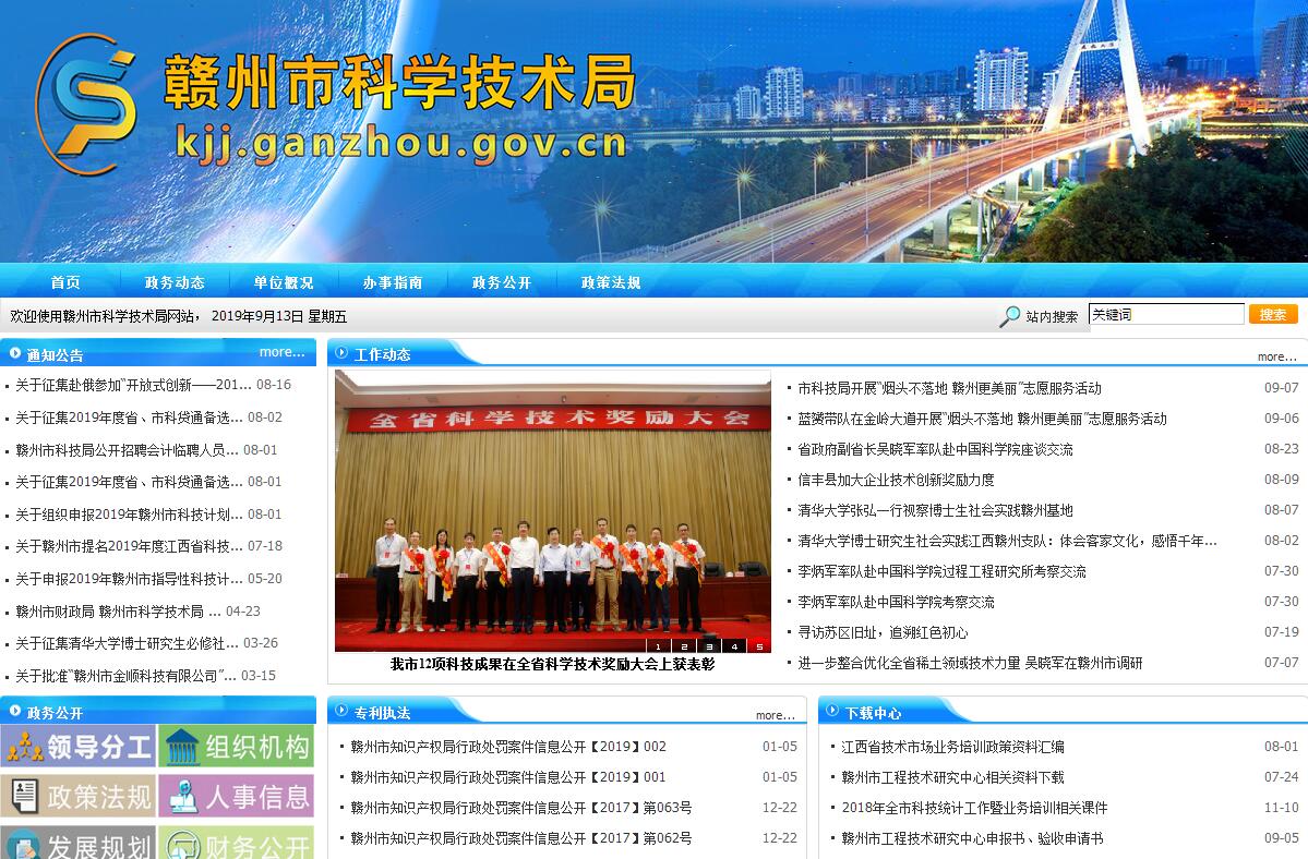 赣州市科学技术局主要职责:1、在全市经济社会发展总体规划的框架内,研究提出科技促进全市经济与社会发展的措施,拟订科技发展规划,并组织实施和监督检查。2、负责组织制订实施全市各类科技计划和重大科技专项与工程,负责统筹协调基础研究、应用技术研究和社会公益性技术研究以及国民经济与社会发展重大关键技术攻关,推动全市科技创新体系建设,负责全市知识产权工作,提高科技创新能力。3、会同有关部门组织科技重大专项实施中的方案论证、综合平衡、评估验收和制定相关配套措施,对科技重大专项实施中的重大调整提出意见。4、组织实施市重点实验室、工程技术研究中心等科技基地计划,会同有关部门拟订重大创新基地建设、科研条件保障的规划和措施,推进科技基础条件平台建设和科技资源共享。5、负责高新技术发展及产业化工作,会同有关部门拟订高新技术产业化措施,指导和协调高新技术产业开发区等科技园区建设相关工作,促进全市高新技术产业化发展;指导和协调全市中小型企业技术创新工作,培育科技型中小企业。6、负责编制并组织实施全市科技促进农村发展的计划,制订相关重要措施和办法,协调农村科技体系建设,组织科技促进现代农业发展的关键技术攻关和成果示范,促进以改善民生为重点的农村建设。7、负责编制并组织实施全市科技促进社会发展的计划,制订相关办法,组织引导社会发展领域的关键技术攻关和成果示范,指导赣南山区开发工程建设,促进以改善民生为重点的社会事业发展。8、会同有关部门拟订促进产学研结合相关措施、制定科技成果推广办法,指导科技成果转化工作,组织相关重大科技成果应用示范,推动企业自主创新能力建设。9、提出科技体制改革的措施建议,推进科技体制改革工作,审核相关科研机构的组建和调整,优化创新体系布局。10、负责本部门预算中的科技经费决算及经费使用的监督管理,会同有关部门提出科技资源合理配置的措施建议,优化科技资源的配置。11、负责科技奖励评审的组织工作,会同有关部门拟订科技人才队伍建设规划,提出相关建议,组织实施科技人才队伍建设的各类计划和创新团队建设。12、制定科普规划,拟订促进技术市场、科技中介组织发展规范性文件并做好协调管理工作,制定科技保密管理办法,负责相关科技评估管理和科技统计管理,组织开展全市国防科技动员工作。13、组织拟订对外科技合作与交流的措施,组织协调全市科技外事工作,负责政府间双边和多边及国际组织间科技合作与交流工作,指导相关部门和县(市、区)科技合作与交流工作。14、承办市政府交办的其他事项。