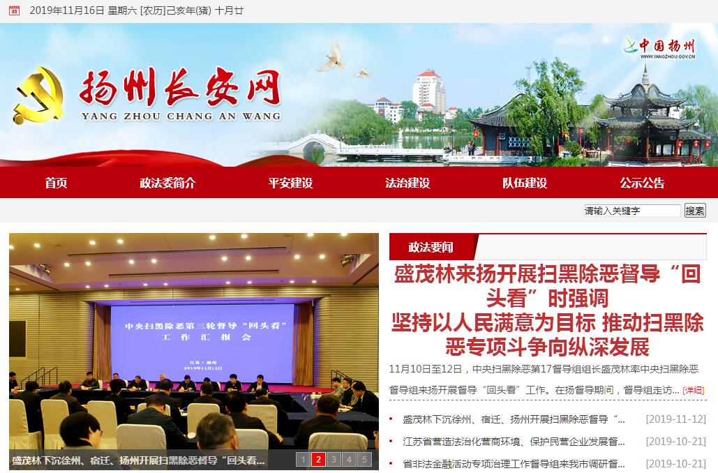 | 网站简介: 扬州市长安网由中共扬州市委政法委员会主办。中共扬州市委政法委员会(简称扬州市委政法委)是市委领导和管理政法工作的职能部门,从宏观上组织领导扬州市政法各部门的工作,指导各县(市、区)党委政法委的工作。其主要职责任务是:根据市委、市政府的路线、方针、政策和部署,统一政法各部门的思想和行动;协助市委研究制定政法工作的方针、政策,对一定时期内的政法工作作出全局性部署,并督促贯彻落实;组织协调指导维护社会稳定的工作;支持和监督政法各部门依法行使职权,指导和协调政法各部门依法互相制约、密切配合;督促、推动大要案的查处工作,研究和协调有争议的重大、疑难案件;组织推动社会管理综合治理工作;组织推动政法战线的调查研究工作,推动政法工作创新;研究、指导政法队伍建设和政法各部门领导班子建设,协助纪检、监察部门查处政法部门领导干部违法犯罪的案件;完成市委交办的其他任务。市委政法委实行民主集中制,书记主持市委政法委员会的工作,各委员集体研究制定市委政法委的部署、决定、规定和要求,并把它贯彻落实到本部门本系统的工作中。 |