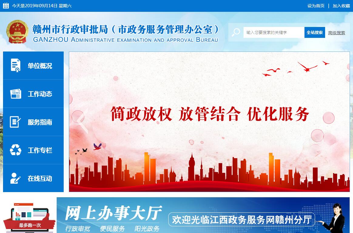 赣州市行政审批局(市政务服务管理办公室)2017年12月28日正式揭牌运行,前身是赣州市行政服务中心。发展至今,始终坚持贯彻落实中央和省、市关于加强和改进政务服务工作的决策部署,坚持需求和问题导向,以“放管服”改革为主线,以“集中、精简、高效、便捷”为目标,不断改进工作作风、提高工作效率,大力推进政务服务标准化和“互联网+政务服务”,着力夯实政务服务体系,优化政务服务流程,为企业和群众提供优质、高效的政务服务。赣州市行政审批局(市政务服务管理办公室)位于赣州市新区长征大道与赞贤路交汇路口。大楼占地面积7.4亩,总建筑面积12000平方米,共8层。楼内设有行政审批服务大厅、并联审批会议室、会议洽谈室、开标室、评标室、询标室、交易大厅,安装了消防、空调、电梯、音响、监控等设备,配置了电脑、指纹打卡机、电子显示屏、电子触摸屏、中心局域网和中心网站等电子政务设施,设立了楼层示意图和咨询导办台。大楼整体布局较为科学合理,配套设施比较齐全,服务功能较为完善,是一个集“行政审批服务、公共资源交易、房地产交易和不动产登记”于一体的政府综合性服务平台。市建设工程招标投标办公室、市国土局不动产登记中心、市房管局房地产交易管理中心整体进驻楼内办公。赣州市行政审批局(市政务服务管理办公室)在赣州市行政服务中心管理委员会上组建,加挂赣州市政务服务管理办公室牌子,实行一个机构两个牌子,为市政府工作部门,正处级。内设办公室(档案科)、政务服务管理科、政务服务监督科、行政审批制度改革科、投资项目审批科、社会事务审批一科、社会事务审批二科、市场服务审批一科、市场服务审批二科、农业事务审批科10个职能科室和机关党总支,人员编制53名。其主要职责是:(一)贯彻执行国家、省、市有关行政审批制度改革、政务服务、政府公共服务热线等方面的方针政策、法律法规和决策部署,制定行政审批局各项规章制度和管理办法,并组织实施。(二)研究探索规范政务服务行为、优化政务服务环境等工作,提出解决意见和建议,为市委、市政府科学决策提供参考。(三)在市审改办指导下,承接国务院和省人民政府下放的行政审批事项,落实国务院和省、市人民政府取消或暂停实施的行政审批事项,下放市人民政府公布的下放事项。(四)负责承担划转行政审批事项的办理及相关联的行政事业性收费,并对审批行为承担相应的法律责任;负责承担相关部门单位委托公共服务事项的办理。(五)负责监督和指导其他市直部门单位保留的行政审批事项及垂直管理部门单位行政审批事项的办理。(六)负责组织、指导、协调、督促全市政务服务体系建设。(七)负责组织、协调、培训、监督、考核、管理行政审批局及进驻中心的部门单位依法、高效办理行政审批、公共服务事项。(八)负责指导、协调、监督、考核市直及垂直管理部门单位设立的专业办事大厅及分中心的工作。(九)负责指导县(区)行政服务中心管委会及瑞金市行政审批局(行政服务中心)工作。(十)负责受理、督办全市政务服务投诉,负责12345政府服务热线的日常管理工作,负责热线平台管理事项的综合协调、分办、督办、考核工作。(十一)负责全市政务服务系统网络信息化建设及“互联网+政务服务”的规划设计和建设维护。(十二)负责中介服务超市的日常运行和管理。(十三)承办市政府交办的其他事项。