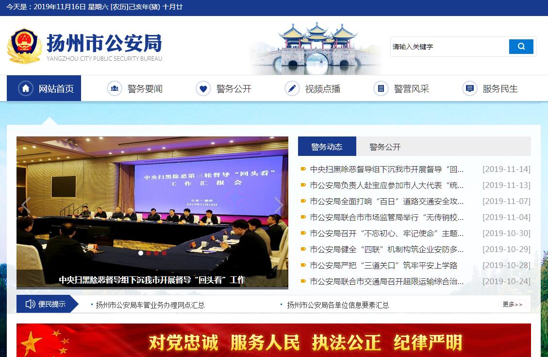 扬州市公安局是扬州市人民政府下设主管全市公安工作的职能部门,受市政府、江苏省公安厅双重领导。各县(县级市)区设公安局(分局),在镇、乡、街道设派出所;公安分局与派出所分别接受同级人民政府和上级公安机关领导。其主要职责是:(一)贯彻执行党和国家关于公安工作的方针、政策和法律、法规;起草有关公安工作的地方性规范文件草案,并组织实施。统一领导、指挥全市公安工作。(二)掌握影响稳定、危害国内安全和社会治安的情况,向市委、市政府和省公安厅及时提供相关重要信息,分析、研究对策并组织实施。(三)负责公安民警队伍的管理、教育和训练工作。(四)受理公民报警救助;依法预防、制止和侦查违法犯罪活动;处置重大案件、治安事故和骚乱,防范、打击恐怖活动。(五)依法查处危害社会治安秩序行为;积极预防、妥善处置突发性事件、群体性事件,维护社会稳定;依法管理集会、游行、示威活动;依法管理危险物品和特种行业等工作。(六)负责由公安机关依法承担的执行刑罚工作;依法承办全市劳动教养、收容教育、强制戒毒审查批准工作;负责市看守所、拘役所、拘留所、戒毒所、收容教育所的建设和管理。(七)负责全市道路交通安全管理,维护交通秩序,承担车辆、驾驶员交通安全管理工作。(八)依法管理国籍、出境入境事务和外国人在我市居留、旅行有关事务。(九)负责全市公共信息网络安全监察工作。(十)负责来扬党和国家领导人、重要外宾的安全警卫工作及其他重要警卫任务的组织协调。(十一)组织实施全市公安科学技术工作;制定公安信息技术、刑事技术、行动技术等建设规划并组织实施。(十二)指导、监督全市国家机关、社会团体、企事业单位和重点建设工程的治安保卫工作以及群众性治安保卫组织的治安防范工作。(十三)组织开展公安警务督察工作;指导、检查、监督全市公安机关及人民警察的执法活动。(十四)负责全市公安机关装备、被装配备和专项经费管理等警务保障工作。(十五)领导全市消防部队建设,组织实施消防工作;对武警支队执行公安任务及相关业务建设实施领导和指挥。(十六)承办市委、市政府和上级公安机关交办的其他事项。