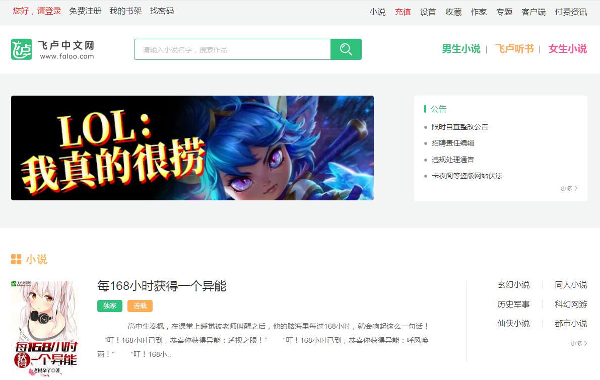 | 网站简介: 《飞卢中文网》提供原创小说阅读,包括:轻小说,玄幻小说,同人小说,穿越小说、青春校园小说等精彩很Hi的小说在线阅读及小说下载。页面简洁,无眩杂广告。 |