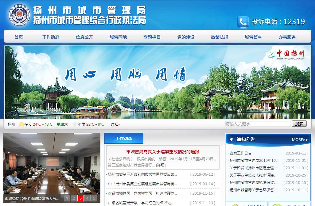 扬州市城市管理局,为市政府工作部门,挂“扬州市城市管理行政执法局”牌子,正处级建制。其主要职责是:(一)城市管理方面:1、贯彻国家有关城市管理方面的法律、法规和方针、政策,结合本市实际拟订本市城市管理的行政措施和规范性文件,并组织实施。2、研究制定本市市容环境卫生发展规划和年度、阶段性工作计划,组织、指导各县(市、区)及有关职能部门、单位开展城市管理工作。3、组织开展城市管理方面法律法规和市容环境卫生管理知识的宣传教育,增强市民的市容环境卫生意识和法制意识。4、负责对户外广告、宣传品设置的管理;负责市区市容美化、灯光亮化的组织、协调和督促检查;负责对市区道路(广场、空地)临时占用的审批与管理。5、组织开展城市管理的综合整治和各项专项整治活动;指导全市开展群众性城市管理基础工作,并定期组织检查、评比活动。6、参与市区主干道两侧和公共场所搭建建筑物、构筑物等设施规划的审核;参与市区市场建设规划项目的审核;参与市区道路两侧和公共场所临时停车点设置的审核;参与市区机动车辆清洗点设置的审核;参与市区城市公交线路的新辟、调整及站台新建、扩建、改建的审核;参与市区主干道两侧新建项目竣工验收和新建住宅小区的综合性验收;参与涉及城市容貌、城市交通秩序及市政府规定应当由市城市管理局参与审核或备案的其他事项。7、完成市委、市政府交办的其他事项。(二)城市管理行政执法方面。1、行使市容市貌、环境卫生管理方面的法律、法规、规章规定的行政处罚权,强制拆除不符合城市容貌标准、环境卫生标准的建筑物或者设施。2、行使城市规划管理方面的法律、法规、规章规定的行政处罚权。3、行使城市绿化管理方面的法律、法规、规章规定的行政处罚权。4、行使市政管理方面的法律、法规、规章规定的行政处罚权。5、行使工商行政管理方面的法律、法规、规章规定的对无照商贩的行政处罚权。6、履行省、市人民政府规定的其他职责。(三)数字化城市管理方面1、负责办理市数字化城市管理监督办公室转来城市管理各类问题的分解,确定处置的责任单位,及时指挥派遣;并将责任单位反馈的办理结果核对后向监督办公室反馈。2、负责组织城市管理有关课题和城市管理体制改革及管理职能调整方面的调查研究,为制定城市管理的相关政策和职能调整提出建议方案;负责对城市管理较为复杂的问题进行分析认定,指导协调对重点、难点问题的综合治理工作。3、综合协调城市管理市、区之间及市有关职能部门(单位)之间的工作关系。4、负责对各区、市各责任部门(单位)城市管理处置情况的跟踪指导督促。5、承办市委、市政府交办的其他事项。