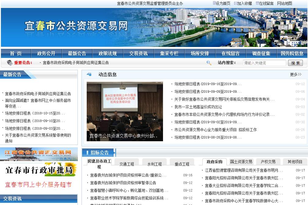 宜春市公共资源交易中心(原宜春市招投标交易中心)成立于2006年1月,是市本级及袁州区进行建设工程招投标、经营性土地(矿产)交易、政府采购和产权交易等交易活动的集中统一的有形市场和交易平台。宜春市行政审批局同时挂宜春市公共资源交易中心牌子,为市人民政府工作部门,正县级机构,负责市本级公共资源交易平台工作,制定进场交易服务、场内管理制度,提供场内交易服务,规范场内交易管理。宜春市行政审批局(宜春市公共资源交易中心)内设公共资源交易管理一科、公共资源交易管理二科、公共资源交易管理三科,具体负责公共资源交易相关职责。宜春市政府采购中心、宜春市产权交易中心为宜春市行政审批局(宜春市公共资源交易中心)下属正科级事业单位。交易中心设市本部和袁州分部两个场所,分别位于宜春市行政中心宜阳大厦中座三、四楼和袁州区行政中心袁州大厦一楼,共有建筑面积4500平方米,有6间开标室、7间评标室(其中电子评标室6间)。科学划分了办公区、服务区、开标区、候标区、视频监控室、询标室、样品区、评委抽取室、档案室等,可以满足多场交易同时进行。配置有全方位数字音视频监控系统、音视频监控数据云平台存储系统、询标对讲系统、电子化交易系统、电子保证金收退系统、评委抽取系统、门禁系统、交易办公OA系统、通讯设备专用保存柜、UPS不间断电源等设备,可对公共资源交易活动进行即时信息发布、全程监控及综合管理。