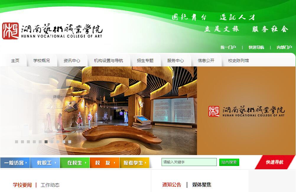 湖南艺术职业学院是国家公办艺术类高等院校。2002年由1951年成立的湖南省艺术学校和1979年成立的湖南省电影学校合并升格为湖南艺术职业学院,目前是湖南省示范性高等职业学院、湖南省文明高等学校、全国基层文化队伍培训基地、全国文化干部培训基地、全国非遗传承人群研培基地,先后荣获全国文化工作先进集体、全国学校艺术教育先进单位、湖南省职业教育先进单位等荣誉。学院座落在国家级生态湿地公园松雅湖东岸。学院以立德树人为根本任务,秉持“德艺双馨,敢为人先”的校训和“围绕舞台,造就人才;立足文旅,服务社会”的办学理念,不断探索校企合作的道路,加强产、学、研融合,拓展职业教育的新理念、新视野,大力弘扬文艺“工匠精神”,培养高素质、多样化的艺术人才。学院现设有戏剧、音乐、舞蹈、影视、美术、文化旅游6个专业系和公共教学部、艺术实践部、艺术培训部、湖南省艺术学校(中专部),共开设26个专业。学院以表演艺术专业为特色,以戏剧、音乐、舞蹈、美术、影视、播音主持等专业为优势,打造了以表演艺术专业群、艺术设计专业群、广播影视专业群、文化旅游专业群为核心的文化艺术专业集群。学院面向全国招生,遵循艺术教育规律,在高职招生的同时招录五年制、六年制中专学生进行长期艺术培养教育,现有全日制在校生6000多人;专任教师255人,正高职称25人,副高职称94人,“双师型”教师107人,多人享受国务院特殊津贴、入选湖南省“121人才工程”、评为省级教学名师、入选湖南省文艺人才扶持“三百工程”,同时,学院还外聘国内外一大批艺术名家来校任教授艺,教师队伍的整体水平逐渐增强。坚守艺术为本,本立而道生。在近70年的办学过程中,学院积淀了深厚的人文艺术底蕴,为社会各界培养艺术人才近5万人。学院师生、校友活跃在国内外艺术领域,创造了一个又一个艺术表演、艺术教育、艺术创作的辉煌。学院加强与国内外艺术类高校和团体的密切联系和合作。随着我国对外开放的不断扩大,学院走出国门,远赴意大利、葡萄牙、突尼斯、约旦、科威特等国家,与国外艺术院校或民间团体广泛开展文化艺术交流活动。同时每年都接待来自法国、意大利、韩国、以色列、黎巴嫩、刚果(金)等国家艺术教育同行的访问演出和文化交流。新时代,新征程。湖南艺术职业学院以更加开放的办学理念,推进建设湖南艺术学院,创新人才培养机制,提高人才培养质量,推进文化传承发展,服务国家艺术发展,为文化强省做出新的贡献。
