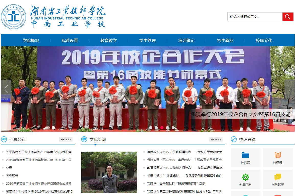 湖南省工业技师学院(中南工业学校)创办于1974年,是国办省属首批国家示范学校、全国黄炎培优秀学校、全国职业教育先进单位,集普通中专教育,中高级技工教育,技师培养,高等成人教育,技能鉴定培训和工程项目建设为一体的综合性高等职业院校。办学定位于中、高级技能人才培养,面向全国招生,在籍生5000余人。湖南省高招代码:4912。[专业品牌优势]学院是国家高技能人才培训基地,是中华全国总工会“全国职工教育培训示范基地”、湖南省总工会农民工创业就业“十佳培训基地”。学院开设的13个专业,技能性强,适用性广,行业优势明显,社会需求量大。其中焊接技术应用、机电设备安装与维修、数控技术应用、化工仪表及自动化专业为国家级重点建设专业。其他省级精品专业2个,省级示范性特色专业2个,省级特色专业2个,省级生产性实训基地2个,开发工学结合的课程标准13门。[师资力量优势]学院下设安装工程系、机械工程系、自动化与控制工程系、商贸工程系,现有教职工262人,其中教授、副教授、高级工程师、工程师、高级技师、技师等高、中级专业技术人员188人,“双师型”教师达85%以上,主体专业由高级工程师和高级技师、技师任实习指导师。学校现有全国化工职教名师4人,湖南省技术能手4人,聘请艾爱国、罗军、王承伟等全国技能大师担任学校重点建设专业技能首席专家。[教学实训优势]学院教学和实训设施完备,有现代焊接安装车间、数控技术培训中心、机械加工、电工电子、电器仪表、工业机器人、模拟安装工程系统、模拟财会系统、制冷空调等实训室60余个,建有焊接、机电、金工、铆钳等实习车间15个,各种实验实训设备16000余台(套),可同时容纳各专业1500余人实习,是车工、数控车工、数控铣工、多工序数控机床操作调整工、焊工的湖南省职业技能竞赛项目基地。同时,学院还在中国化学工程总公司、中石化总公司、中国核电建设集团、格力集团、中联重科、中集集团等企业设有校外实习基地46个。[技能考证优势]国家人力资源和社会保障部在学院设立的“国家职业技能鉴定所”,连续三年被评为湖南省“十佳职业技能鉴定所”,可对化工、机械、电工电子、建筑安装等行业8个工种进行技术等级鉴定,具有高、中、初级职业资格证(全国通用)发证资格。[就业网络优势]“突出学生动手能力,培养高技能人才”是学院的主要办学特色,过硬的操作技能和“一专多能”是学院毕业生的主要就业竞争优势。学院已与中石化、中石油、中化集团、中核集团、中联重科、三一重工、长沙远大、中国水电八局、泰富重装、格力电器集团、美的集团、海信集团、新加坡PEC等60多家国内外知名企业建立了良好的人才供求关系,毕业生就业率达98%以上,深受用人单位欢迎。[学历教育优势]努力提高学生素质,培养复合型适用人才。学院还与武汉工程大学等院校联合开办了“高等教育函授站”,开设本、专科专业共10个,为本院学子及广大有志社会青年提供了极佳的第二学历深造机会。