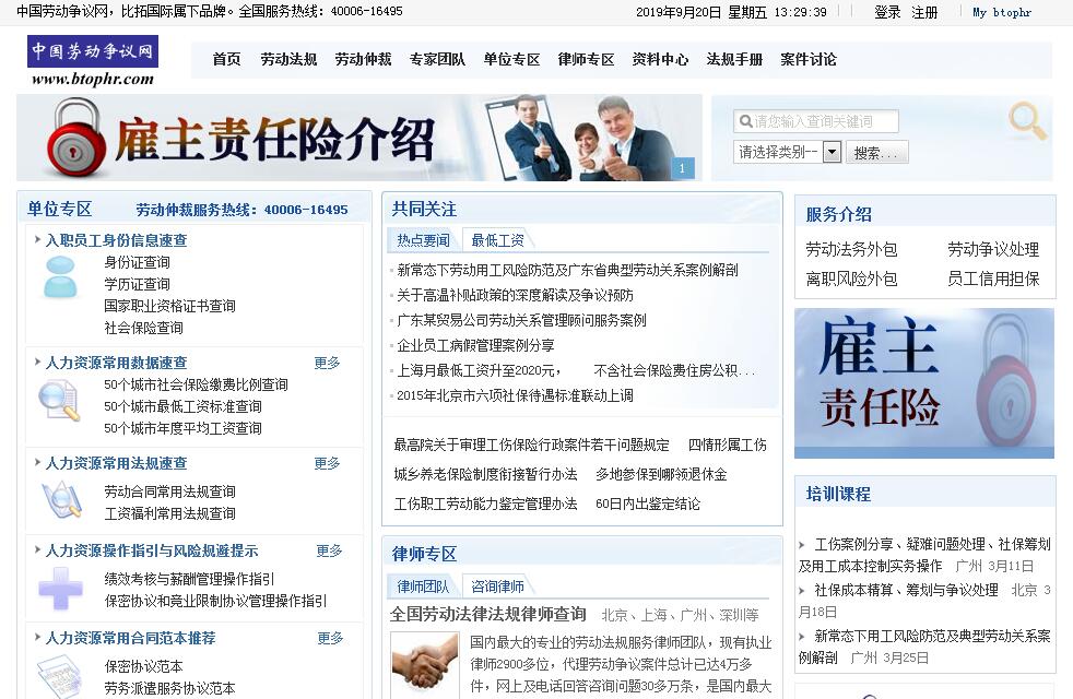 | 网站简介: 中国劳动争议网(www.btophr.com)是在国家人力资源与社会保障部专家指导和支持下成立的劳动法专业网站,是国内最大、最专业、最权威的劳动法专业网站。中国劳动争议网不但拥有50多名国内最专业劳动法专家组成的专家团队,还拥有2900多名律师组成的国内最大的劳动法律师团队,同时拥有单位及个人会员客户50多万。中国劳动争议网基于对劳动法权威而专业的研究、丰富的劳动争议处理经验及权威的政府关系,向客户提供专业、高品质、一站式的劳动法务外包、劳动争议处理、离职风险外包与员工信用担保服务。中国劳动争议网的投资方是比拓国际,比拓国际是世界上首家专业从事雇主风险管理的服务机构, 国内首家拥有律师事务所的人力资源服务机构。在香港、北京、上海、广州、深圳设有独立法人公司及遍布全国四十多个城市的连锁服务机构。比拓国际基于对劳动法、人事风险管理与用工成本控制的深入研究及中国人民大学劳动人事学院的智慧支持,提供专业的人事风险外包、用工成本控制、薪酬福利管理与人力资源外包等专业服务。 |