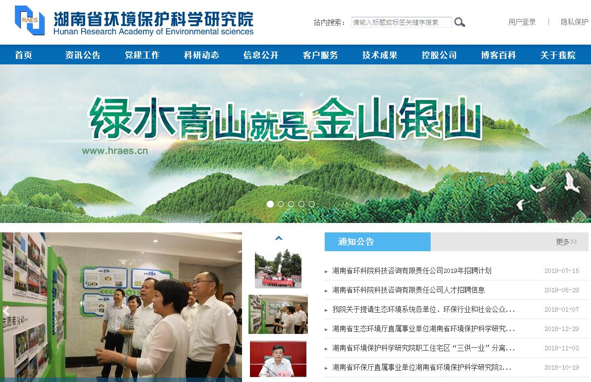 湖南省环境保护科学研究院创建于1975年7月,公益二类事业单位,隶属湖南省生态环境厅和湖南省科技厅双重领导。现有在职职工210人,其中正、副高级职称专技人员40人、中级专技人员77人;博士18人,硕士90人。享受国务院政府特殊津贴、湖南省政府特殊津贴、湖湘青年英才、121创新人才等各类创新型人才十余人。我院主要从事水生态环境、大气环境、土壤生态环境、固体废物与危化品等领域科学研究与污染控制技术研发、生态环境经济与生态文明建设相关政策、法规、规划、标准研究。开展危险废物处置评估、生态环境损害司法鉴定、环境工程设计、工程总包、清洁生产审核、环境监测分析、安全与职业卫生评价等咨询业务。我院建有“国家环境保护有色金属污染控制工程技术中心”、“水污染控制技术湖南省重点实验室”、“环境友好与资源高效利用化工新技术湖南省2011协同创新中心”、“生态环境损害司法鉴定中心”、“湖南省环境风险与污染损害鉴定评估中心”、“湖南省清洁生产中心”等技术研发和服务平台;与中国环境科学研究院共建“洞庭湖野外生态环境观测研究站”;与生态环境部华南环境研究所共同建“珠江流域水环境联合研究院”;与湖南省质量和标准化研究院共建“国家技术标准创新基地(长株潭)”。目前实验室共有单台超过10万元的仪器设备50余台套,如ICP-MS、能谱仪、X衍射光谱仪等大型先进检测设备,总价值达两千多万元,实验室总面积3471.2平方米。近年来我院先后承担了国家科技重大专项“水专项”课题、国家自然科学基金、国家科技支撑计划、国家环境保护公益性行业科研专项、科技部国际合作专项、欧盟和联合国国际合作项目、湖南省科技重大专项项目、湖南省科技重点研发计划项目等100余项科研项目和课题,依托相关科研项目产出了60余项科技成果,其中“湘江水环境目标重金属污染仿真预测与管理决策系统”、“湿法炼锌复合重金属废水处理新技术”、“重金属污染土壤植物修复新技术”、“有色冶炼渣中有价金属提取技术”等多个成果居国际先进或国内领先水平;承担了湖南省“八五”至“十三五”期间的环保规划及国家有关子规划编制,出台《湘江流域重金属污染综合防治实施方案》等重点区域重金属污染综合防治实施方案20余项;编制了《洞庭湖生态经济区环境保护专项规划》、《长株潭大气污染联防联控规划》等区域生态环境保护规划20余项。负责划定了湖南省生态保护红线、湖南省大气环境质量底线和资源利用上线,编制了湖南省“碧水、蓝天、净土”保卫战及“气十条、水十条、土十条”湖南省实施方案等等;编制了《粗铅冶炼环境风险等级划定办法》、《湖南省典型涉重金属行业环境准入控制办法》、《湖南省排污费改环境保护税税额标准》等多项政策,以及《湖南省重金属污染土壤修复标准》和全国首个铊排放标准《湖南省工业废水铊污染物排放标准》等30余项地方标准。我院先后获得国家科技进步奖、国家环境保护科学技术奖、湖南省科技进步奖等国家级及省市级科技奖项100余项; 2011年被湖南省政府授予“湖南省标准化工作先进集体”;2012年被环保部授予“‘十一五’国家环境保护科技工作先进集体”;2012年-2018年,连续被评为省直文明标兵单位,2018年获评湖南省模范职工之家。