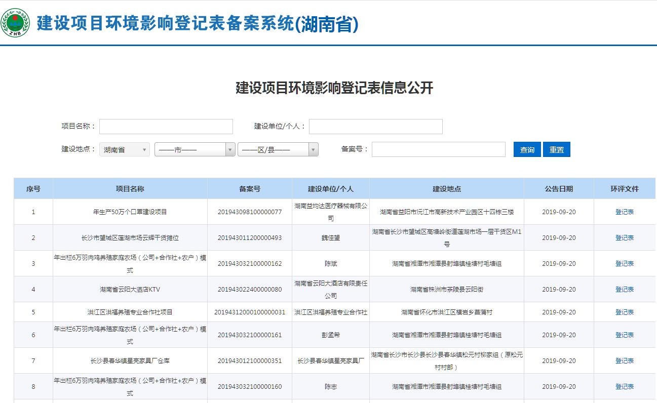 | 网站名称: | 湖南省建设项目环境影响登记表备案公示 | ||