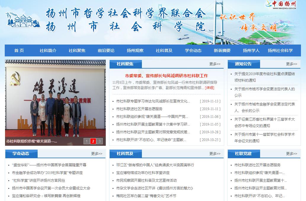 扬州市哲学社会科学界联合会(简称市社科联)成立于1984年,是中共扬州市委领导下的学术性群众团体,是扬州市社会科学类学术性社会团体的业务主管部门,实行团体会员制,最高权力机构为会员代表大会,由代表大会选举产生的理事会和常务理事会是会员代表大会闭会期间的执行机构,任期5年。理事会每年召开一次会议,听取工作汇报,制定工作计划,决定重大事务。市社科联常设工作机构有办公室、学会工作部,出版期刊《扬州社会科学》。目前共有所属社科类学会、协会、研究会61家。市社科联的宗旨是以马列主义、毛泽东思想、邓小平理论和“三个代表”重要思想为指导,全面贯彻落实科学发展观,坚持“为人民服务、为社会主义服务”的方向和“百花齐放、百家争鸣”的方针,团结和组织全市哲学社会科学工作者,促进哲学社会科学事业的繁荣和发展,发挥认识世界、传承文明、创新理论、资政育人、服务社会的重要作用,为全面推进社会主义经济建设、政治建设、文化建设、社会建设以及生态文明建设和人的全面发展提供思想保证、精神动力和智力支持。扬州市社会科学院于2010年10月正式成立,为县处级全额拨款事业单位,主要承担着重大课题研究、提供决策咨询、开展学术交流等职责。成立以来,市社科院致力于加强社会科学的应用对策研究,充分发挥地方社科院助推经济社会发展的积极作用,通过编写《扬州经济社会发展蓝皮书》、开展调研活动等工作,逐步搭建全市性的社科研究平台,充分激发社科界专家学者的研究活力,为市委、市政府科学决策提供服务。