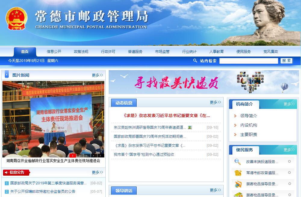 | 网站简介: 常德市邮政管理局主要职责:一、贯彻执行国家邮政法律法规、方针政策和邮政服务标准;二、研究拟订本地区邮政发展规划;三、监督管理本地区邮政市场以及邮政普遍服务和机要通信等服务的实施;四、负责行业安全生产监管、统计等工作;五、保障邮政通信与信息安全;六、承办省邮政管理局及市人民政府交办的其他事项。 |
