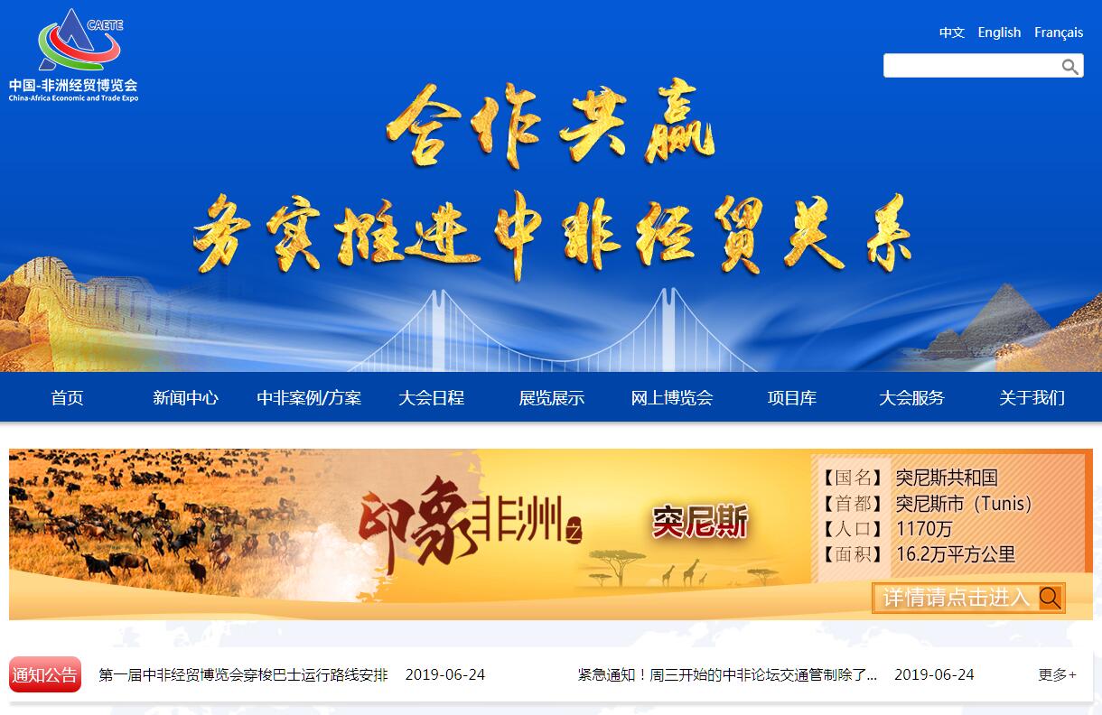 | 网站简介: 中国-非洲经贸博览会由中华人民共和国商务部与湖南省人民政府共同主办,是中非合作论坛机制下最重要的经贸合作平台之一。第一届中国-非洲经贸博览会将于2019年6月27日至29日在湖南省长沙市举办,博览会以“合作共赢,务实推进中非经贸关系”为主题,聚焦贸易促进、投资推介、农业技术、能源电力、合作园区、基础设施及融资合作等重点领域,将举办形式多样、内容丰富的各项活动。届时,中国和非洲各国政要、使节、州省(郡、市)长、国际组织代表、企业家、金融机构、商协会、采购商、参展商、专家学者及媒体代表等数千人将齐聚长沙,共襄盛会。 |