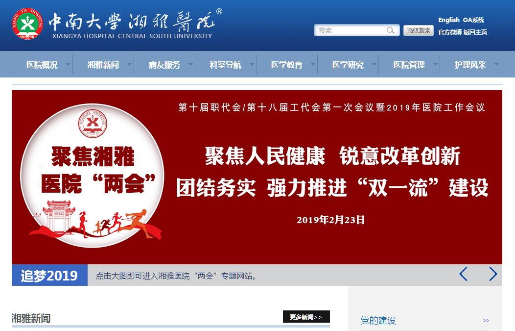 中南大学湘雅医院(Xiangya Hospital Central South University)创建于1906年,坐落在人文荟萃的楚汉名城长沙,是国家卫生健康委员会直管的三级甲等综合医院,是教育部直属高校中南大学的附属医院,是我国重要的临床诊疗、医学教育与科技创新中心,以精湛的诊疗技术、卓越的科教实力、深厚的文化底蕴享誉海内外。二十世纪初,美国耶鲁大学校友成立雅礼协会(Yale-China Association),开启来华兴医办学的重要篇章。1906年,美国医学博士爱德华·胡美(Edward H.Hume,1876-1957)受雅礼协会委派来到中国,在长沙西牌楼创建了雅礼医院(Yale Hospital)。1914年,湖南省政府委托育群学会与美国雅礼协会合作,创办我国第一所中美合办的高等医学教育机构——湘雅医学专门学校,雅礼医院随之更名为湘雅医院(Hsiangya Hospital),湘即湖南简称,雅即Yale之音译。建院伊始,湘雅医院即将欧美医学最高标准融入办医理念,从长沙西牌楼一幢旧房起步,筚路蓝缕、精勤进取,发展成为中国著名的综合医院,培养造就了有“协和泰斗、湘雅轩辕”之称的著名医学家、中国科学院首批学部委员张孝骞,享誉世界的医学微生物学家汤飞凡,中美交流使者李振翩等多位现代医学名家。新中国成立后,湘雅医院矢志不渝护卫人民健康,坚持不懈攻克疑难重症,屡次创造国内第一:首次采用中药治疗姜片虫感染,首次采用针刺活检法确诊支气管癌,首次开展同种异体异位部分肝移植,首次开展体外循环下同种异体单肺移植,首次腹腔镜下全盆腔脏器切除术,首次内镜下椎管内硬膜下神经鞘瘤切除术,首次保留变性真皮与大张自体皮移植修复手部深度烧伤术,首次左心转流下胸腹主动脉人工血管置换术等,有力推动了医学事业发展,在神经肿瘤、神经系统退行性疾病、黑色素瘤、骨关节炎、显微外科等方面研究与诊疗处于全国领先水平。百十余年来,湘雅人以执着的医志、高尚的医德、严谨的医风、精湛的医术书写了我国西医发展史的重要篇章。进入新时代,湘雅医院遵循“公勇勤慎、诚爱谦廉、求真求确、必邃必专”的校(院)训,秉承“严谨、求实、团结、进取”的院风,医疗服务、学科建设、人才培养、科技创新等各项事业取得了长足发展,整体实力稳居公立医院“第一方阵”,深受人民群众赞誉和信赖。医院拥有雄厚的临床诊疗能力。编制床位3500张,总建筑面积51万平方米,2018年门急诊296万人次,出院13.8万人次,手术7.4万台次。开设临床医疗医技科室和亚专科88个,病区75个,护理单元100个。拥有国家重点学科7个,国家临床重点专科25个。神经内科、神经外科、皮肤科、骨科、呼吸内科、老年病学等专科的诊疗水平和科技影响力位居全国前列。配备PET-CT、高端MRI、数字减影血管造影(DSA)、TOMO刀、BrainLab神经导航系统及东南亚首个Buzz数字化手术室等一大批先进的医疗设备,诊疗条件和水平稳居国内先进行列。医院拥有一流的医学人才队伍。现有专业技术人员4656人,高级专业技术人员659人,医师中有博士学位人员达81.05%。现有博士生导师152名,硕士生导师386名。现有中国工程院院士1名,国家级人才项目获得者29人,国家级教学名师2名,国家卫生健康委有突出贡献中青年专家6名,享受国务院特殊津贴教授71名,教育部新世纪优秀人才支持计划11名。医院拥有卓越的医学教育实力。具备医学本科生、研究生、进修生、住院医师规范化培训等完整的学位教育和继续教育教学体系,首批入选国家临床教学培训示范中心,是中国住院医师培训精英教学医院联盟首批成员。现有国家级精品资源共享课程4门,国家级精品视频公开课1门。获得国家高等医学院校大学生临床技能竞赛特等奖。常年承担国家西部卫生人才培训任务。医院拥有领先的科技创新水平。现有国家老年疾病临床医学研究中心、医学代谢组学国际联合研究中心、抗癌药物国家地方联合工程实验室等国家级科研平台3个、省部级重点实验室和研究中心31个,主办主编国家级医学专业期刊8本、英文期刊1本。周宏灏院士领衔的科研成果荣获2018年度国家科技进步二等奖。近五年,医院获批国家自然科学基金项目462项,获批各类科研课题2060项,科研经费达6.5亿元,获得国家级和省部级科技成果奖54项,专利授权302项,发表SCI论文2262篇,有关成果以第一(通讯)作者单位在Science、JAMA等国际著名期刊发表。湘雅医院始终坚持公立医院公益性,率先构建“合作办院、协作指导、远程指导、专科联盟、航空医疗联盟、区域医联体”六位一体的医联体“湘雅模式”,率先在国内开办皮肤病互联网医院,优质医疗资源可及性不断提高,引领区域医疗水平提升的能力日益增强。胸怀博爱奉献情怀、心系人民健康福祉,在扶贫攻坚、对口帮扶、支边援外、抗震救灾等方面体现湘雅人的责任与担当。近年来,组建14支国家医疗队赴贵州毕节、云南迪庆执行国家巡回医疗任务,牵头组建两批应急医疗队赴塞拉利昂抗击埃博拉疫情,率先建成国家卫生应急移动处置中心。先后获得“全国百佳医院”、“百姓放心示范医院”等荣誉称号,受到党和国家领导人的赞誉和肯定。激越华章已百载,医海求真再扬帆。湘雅医院在习近平新时代中国特色社会主义思想指引下,按照新时代党的卫生健康工作方针和教育工作方针,坚持以人民健康为中心,坚持“双一流”建设目标,以党建为引领,以学科建设为核心,以人才建设为