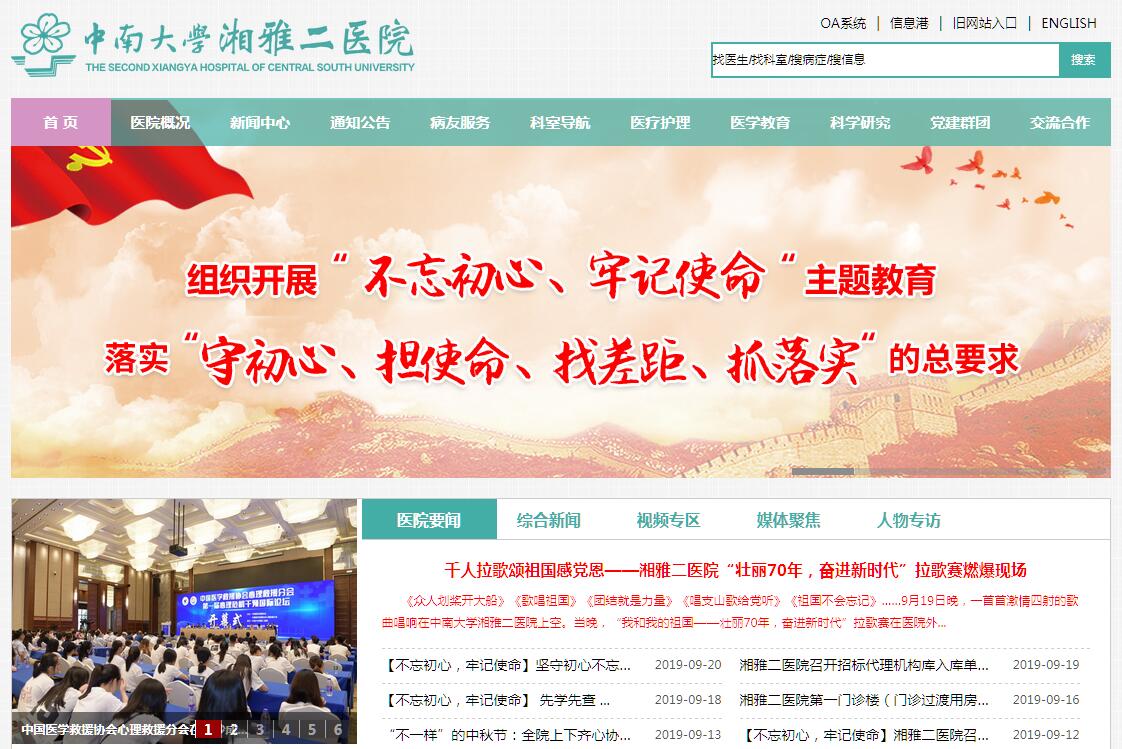 中南大学湘雅二医院始建于1958年,是中南大学的附属医院,也是国家卫生健康委预算管理医院。是国内学科最齐全、湖南省规模最大的大型三级甲等医院,素有“南湘雅”美誉, 在复旦大学中国医院排行榜中,综合实力居全国第13位、专科声誉居全国第15位。医院占地面积260余亩、医疗建筑面积39.6万平方米、编制床位3500张,拥有40个临床科室、9个医技科室;现有在职职工4907人,其中副高及以上专家716人,国家“千人”学者、长江学者4人,国家“优青”2人,国家级教学名师/全国优秀教师3人,国家卫生健康委有突出贡献中青年专家7人,享受国务院特殊津贴专家(健在)62人,湘雅名医42人;现在国际学术机构任职39人次,国际学术期刊任职30人次。治病救人方面,医院拥有国家临床重点专科23个,精神病学科、代谢内分泌科、心血管外科、皮肤性病科、老年病科、临床药学、器官移植等专科居全国前列;2018年医院门急诊量逾355.5万人次,出院病人15.8万人次,居湖南省首位;作为湖南省干部保健基地,承担了省内绝大部分省厅级以上领导干部和所有来湘党和国家领导人的健康保健任务;是国家紧急医学救援队依托单位,近年来参与了国内几乎所有突发卫生应急事件的医学救援。教书育人方面,在院本科生、研究生2200余人,拥有临床医学等一级学科博士点6个、二级学科博士点31个,博士生导师110人;拥有国家级实验教学示范中心、国家级特色专业、国家级教学团队及国家级教学名师,国家精品课程及国家精品资源共享课共5门,获得全国优博论文2篇;获得全国高校大学生临床技能竞赛特等奖6次。科学研究方面,拥有国家临床医学研究中心2个、国家地方联合实验室1个、省部级重点实验室/研究中心12个,国家重点学科6个;牵头获得国家科技进步奖10项;近五年承担国家级课题420项,其中国家重点研发计划项目(课题)12项,国家“973”和“863”项目(课题)6项,国家支撑计划项目、国家科技重大专项、国际合作重点项目等18项,连续五年入选湖南省十大科技新闻;内分泌病学与代谢病学、精神病学、风湿病学与自身免疫病学、肾脏病学、皮肤病学科技影响力居全国十强。医院第四次党代会(2019年)提出了建设现代一流研究型医院的发展目标,具体包括:近期目标:未来五年,综合实力跻身全国十强,进入国内一流医院行列;中期目标:建院80周年前后,在十强基础上稳中有进,进入国内一流医院前列;远期目标:建院100周年前后,医院工作全面走向卓越,跻身世界一流医院行列。