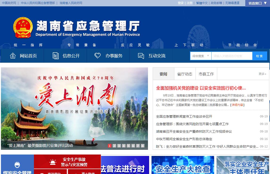 湖南省应急管理厅贯彻落实党中央关于应急工作的方针政策和决策部署,全面落实省委关于应急工作的部署要求,在履行职责过程中坚持和加强党对应急工作的集中统一领导。其主要职责是:(一)负责应急管理工作,指导全省各地区各部门应对安全生产类、自然灾害类等突发事件和综合防灾减灾救灾工作。负责安全生产综合监督管理和工矿商贸行业(含煤矿)安全生产监督管理工作。(二)贯彻实施相关法律法规、部门规章、规程和标准,组织编制全省应急体系建设、安全生产和综合防灾减灾规划,组织起草相关地方性法规、规章草案,组织拟订相关政策、规程和标准并监督实施。(三)指导应急预案体系建设,建立完善事故灾难和自然灾害分级应对制度,组织编制湖南省总体应急预案和安全生产类、自然灾害类专项预案,综合协调应急预案衔接工作,组织开展预案演练,推动应急避难设施建设。(四)牵头推进全省统一的应急管理信息系统建设,负责信息传输渠道的规划和布局,建立监测预警和灾情报告制度,健全自然灾害信息资源获取和共享机制,依法统一发布灾情。(五)组织指导协调安全生产类、自然灾害类等突发事件应急救援,承担省应对重大灾害指挥部工作,综合研判突发事件发展态势并提出应对建议,协助省委、省政府指定的负责同志组织重大及以上灾害应急处置工作。(六)统一协调指挥各类应急专业队伍,建立应急协调联动机制,推进指挥平台对接,负责做好解放军和武警部队参与应急救援相关衔接工作。(七)统筹全省应急救援力量建设,负责消防、森林和草原火灾扑救、抗洪抢险、地震和地质灾害救援、生产安全事故救援等专业应急救援力量建设,依权限做好驻湘国家综合性应急救援队伍建设的相关工作,指导地方及社会应急救援力量建设。(八)负责全省消防管理有关工作,指导地方消防监督、火灾预防、火灾扑救等工作。(九)指导协调全省森林和草原火灾、水旱灾害、地震和地质灾害等防治工作,负责自然灾害综合监测预警工作,指导开展自然灾害综合风险评估工作。(十)组织协调灾害救助工作,组织指导灾情核查、损失评估、救灾捐赠工作,按权限管理、分配中央下达和省级救灾款物并监督使用。(十一)依法行使安全生产综合监督管理职权,指导协调、监督检查省政府有关部门和各市州政府安全生产工作,组织开展安全生产巡查、考核工作。(十二)按照分级、属地原则,依法监督检查工矿商贸生产经营单位贯彻执行安全生产法律法规情况及其安全生产条件和有关设备(特种设备除外)、材料、劳动防护用品的安全生产管理工作。负责监督管理工矿商贸行业省属企业安全生产工作。依法组织并指导监督实施安全生产准入制度。负责危险化学品安全监督管理综合工作和烟花爆竹安全生产监督管理工作。(十三)负责全省煤矿安全生产地方监管和煤矿安全基础管理监督指导工作。(十四)依法组织指导生产安全事故调查处理,监督事故查处和责任追究落实情况。组织开展自然灾害类突发事件的调查评估工作。(十五)开展应急管理对外交流与合作,组织参与安全生产类、自然灾害类等突发事件的对外救援工作。(十六)制定全省应急物资储备和应急救援装备规划并组织实施,会同省粮食和储备局等部门建立健全应急物资信息平台和调拨制度,在救灾时统一调度。(十七)负责应急管理、安全生产宣传教育和培训工作,组织指导应急管理、安全生产的科学技术研究、推广应用和信息化建设工作。(十八)承担省防汛抗旱指挥部日常工作,协调省防汛抗旱指挥部成员单位的相关工作,组织执行国家防汛抗旱总指挥部、相关流域防汛抗旱指挥机构和省防汛抗旱指挥部的指示、命令。(十九)完成省委、省政府交办的其他任务。
