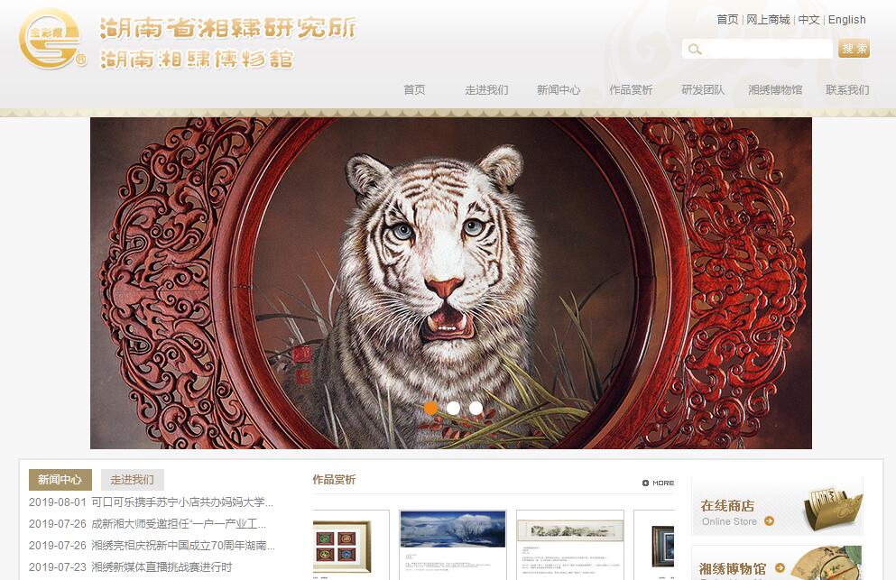 湖南省湘绣研究所是中国湘绣生产、研发、销售的专业机构,2011年被商务部认定为中华老字号,2014年被文化部命名为国家级非物质文化遗产生产性保护示范基地,2016年被省文化厅认定为湖南省非物质文化遗产代表性项目保护单位。所内集中有包括九位国家级工艺美术大师、十位省级工艺美术大师在内的一大批专业技术人才,产品定位走高精艺术路线,具有前瞻性、引领性、创新性和高艺术附加值的特点,拥有多项核心技艺,独创“鬅毛针”绝技使狮虎成为湘绣经典代表作,研制的双面全异绣工艺被世人誉为“令人不可思议的魔术般的艺术”。产品以湖湘文化为底蕴,博采众长,形成了大气、雄浑的独特风格,做到了华美而不失庄重,大气而不失精细,“金彩霞”品牌为中国驰名商标,多次荣获国内外奖项,并被国家机构和社会各界广为收藏,是国礼制作和涉外参观定点单位。代表作品《雄狮》《饮虎》《望月》等荣获中国工艺美术百花奖金杯奖,并被国家工艺美术馆收藏;大型双面座屏《百鸟朝凤•洞庭春色》被湖南省人民政府赠香港特区政府以贺百年回归之礼;《毛主席和五十六民族》《岳阳楼》《张家界》等多幅巨型作品陈列于人民大会堂;《荷塘清趣》、《毛利族大会堂》、《布什总统全家福绣像》等作品被作为国礼由国家元首外赠;大批优秀精品被中南海、国家各部委、军委及大军区和湖南省委常委楼、省委九所宾馆、蓉园宾馆,湖南省人民政府大楼、湖南宾馆等重要场所展示陈列;《经天纬地·和平中国》获2010年上海世博会“迎世博纪念品全球华人设计大奖赛”最佳刺绣艺术奖,并被上海世博会纪念馆收藏。2011年11月,研制的50克双面绣湘绣请柬《锦绣潇湘请你来》成功搭载“神舟八号”遨游太空17天,被誉为“最有文化底蕴的搭载物”。2012年7月,我所研制的巨幅山水湘绣《冬雪北国》悬挂于全国人大常委会议厅,被誉为“传世佳作”。2013年,我所研制的16件湘绣艺术品在香港保利“湘绣湘瓷艺术精品拍卖会”上成功拍卖,其中《山兽之君》以220万元人民币成交,创下了湘绣老虎头作品在海外市场的最高价纪录。