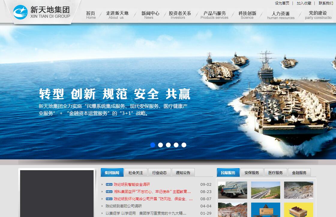 湖南新天地投资控股集团有限公司(简称“新天地集团”)是2012年2月8日组建的大型国有企业集团,下辖5家一级子公司和100多家二、三级子(分)公司。5家一级子公司分别是湖南南岭民用爆破器材股份有限公司、湖南新天地保安服务有限公司(湖南悍豹武装押运公司)、湖南神斧投资管理有限公司、湖南省南岭化工集团有限公司、湖南金能科技股份有限公司。其中南岭民爆系中国民爆行业11家上市公司之一,荣膺“第四届中国中小板上市公司五十强”。金能科技公司是国家民爆行业重点扶持的研究开发型高科技龙头企业。新天地保安服务公司(湖南悍豹武装押运公司)综合实力位居全国武装守押行业前十强。“十三五”期间,新天地集团全力打造民爆系统集成服务产业平台、现代安保服务产业平台、医药医疗健康服务平台、金融资本服务业务平台,将集团从传统的生产制造型企业逐步转型为服务制造型企业,走产业资本与金融资本融合发展的道路,向产业优势突出、产融深度结合的投资控股集团迈进。民爆系统集成服务产业平台:集团正从传统的民爆器材生产经营供应商向民爆系统集成服务商转变,打造民爆全产业链,抢占技术服务和终端服务两大价值链高端。现拥有工业索类火工品产能4亿米,居全国第一位;工业雷管产能2.9亿发,居全国第二位;工业炸药产能16.9万吨,居全国第五位;具备民用爆破器材生产许可权、自营民爆产品出口经营权、工程爆破设计和施工一级资质、工程建设设计甲级资质、世界制造厂识别代号证、危爆物品物流运输业务、武器装备科研生产许可证等10余特许经营资质。是中国民爆行业集研发、技术、装备、生产、销售、工程设计与爆破服务全产业链一体化经营企业,民爆主业的主要经济技术指标位居全国前列。现代安保服务产业平台:集团重点以武装守护押运业务为突破口,做强做大以金融科技为特色的金融企业外包集成服务;利用高新技术,发展高附加值的智能安防服务、互联网安保服务、特种安保服务,全力拓展国际化经营。主营武装押运、门卫、巡逻、守护、随身护卫、安全检查、安全技术防范、劳务派遣等保安服务业务。现有湖南悍豹武装押运有限公司、岳阳市保安服务有限公司、长沙新天地金融服务外包有限公司、湖南新天地智能安全科技有限公司、湖南新天地物联科技有限公司、湘潭保安分公司、常德保安分公司等子(分)公司。其中,湖南悍豹押运有限公司是“全国十佳保安服务公司”及“全国十强保安企业”。战略新兴产业平台:集团打造生物制药、医药中间体、精细化工等战略性新兴产业发展平台,在“特”、“精”、“新”上做文章,推进轻资产、高效益的投资运营模式,高标准、高起点打造医药医疗健康服务平台。金融资本服务业务平台:是集团扩大资产管理与资本运营服务、实现产融结合、促进产业优化的重要平台。集团加强以央企为主的战略合作,在湖南省政府的引导下设立相关产业发展基金,走产业资本与金融资本融合发展的道路,拥有上市公司和军民整合产业发展基金等类金融平台,主营金融投资、工程建设、油茶产业等。