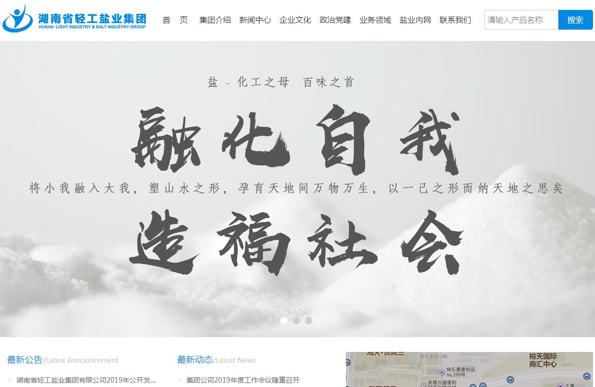 湖南省轻工盐业集团是一家以盐及食品、投资及金融管理、医疗健康为主业的省属国有大型企业。集团现拥有18家全资、控股、参股公司及科研设计院所。旗下湖南盐业股份公司是全国第一家跨省联合、产销一体的现代股份制企业,2018年3月26日,公司股票成功在上海证券交易所挂牌上市,股票代码600929。集团资产总额上百亿元,员工9800余人,连续多年成为省国资委绩效考核A类企业,综合实力居全国同行业前列。2017年,在省委、省政府和省国资委的坚强领导下,在省派监事会的有力监督下,集团以“打赢盐改攻坚战”为首要任务,协调发展三大板块,深化改革改制,强化内部管控,全面从严治党,实现了公司稳定健康发展。集团一贯秉承“融化自我、造福社会”的企业精神,积极履行国有企业的政治责任和社会责任。近年来,先后荣获“全国食盐市场管理先进单位”、 “湖南省平安单位”、“省文明标兵单位”、“反腐倡廉先进单位”等称号,连续获得“中国轻工业百强企业”、 “中国服务业500强企业”、“中国轻工业盐业运销行业十强企业”、“ 全省综治维稳先进集体”等称号,得到社会广泛认可。展望“十三五”,集团致力于丰富和健康人们的日常生活,将努力成为盐行业改革的领跑者、整合者,成为国有企业改革和转型发展的探索者、示范者,成为线上线下相结合的现代食品生产者、供应商,成为医疗健康产业改革的参与者、实践者,最终成为一个市场化、现代化、产融结合的新国企。