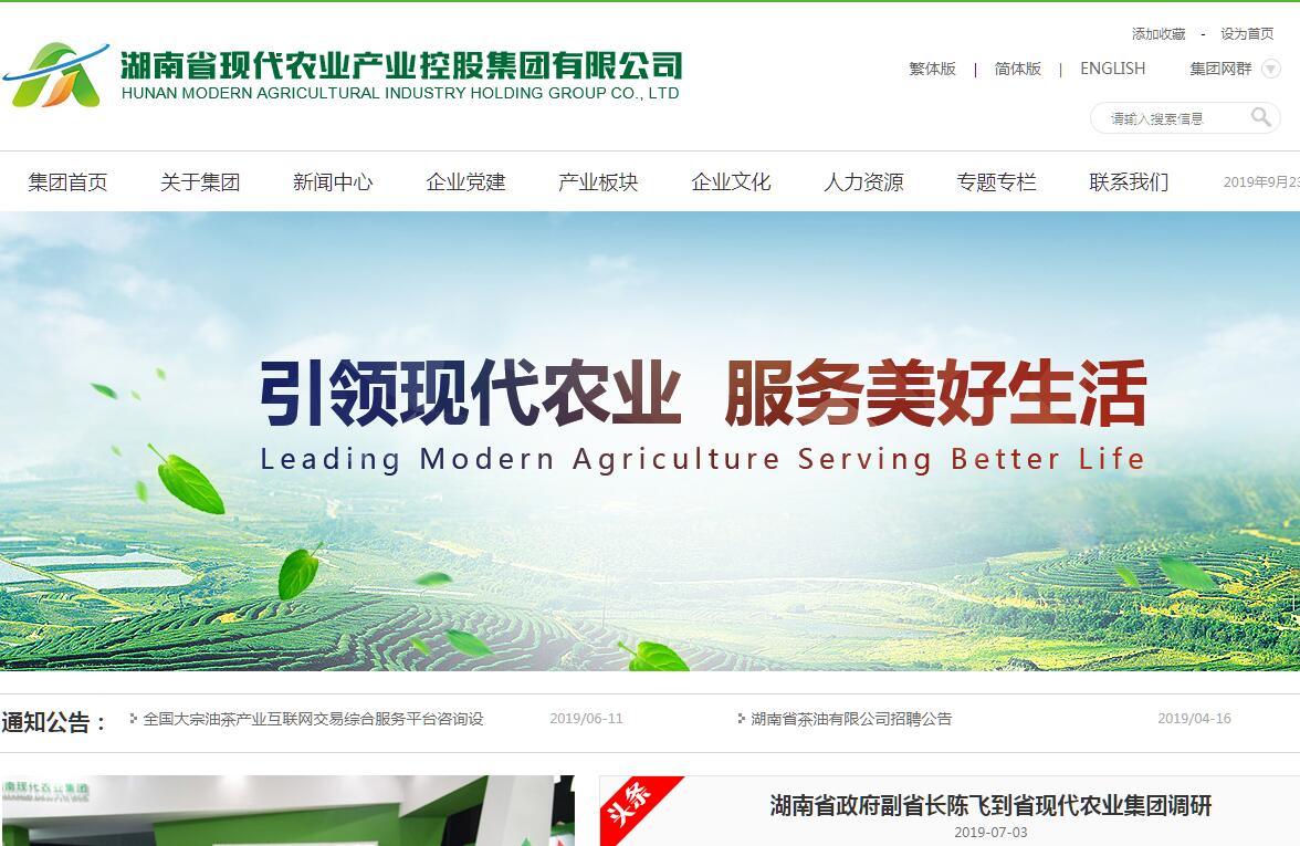 湖南省现代农业产业控股集团有限公司(简称:省现代农业集团)是经省委、省政府批准,着眼现代农业产业的发展,推动国企重组整合,重构市场竞争新动能、新优势,整合省内九家农业龙头企业组建而成的国有独资大型企业。集团注册资本40亿元,总资产140亿元,年产值近100亿元,现有职工总数5000余人。省现代农业集团现有16家成员企业,分别是:湖南新五丰股份有限公司(上交所上市企业,代码600975.sh),湖南粮食集团有限公司(控股上交所上市公司金健米业,代码600127.sh),湖南省粮油食品进出口集团有限公司,湖南天下洞庭粮油实业有限公司(湖南省军粮集团有限公司),湖南省农业集团有限公司,湖南天心种业股份有限公司,湖南天劲制药有限公司,湖南省茶油有限公司(湖南林之神生物科技有限公司),湖南现代农业高科技有限公司,湖南现代农业产业基金管理有限公司,湖南现代农业国际发展有限公司,湖南天心博力科技有限公司,湖南联畅房地产开发有限公司(物业公司)。托管湖南省机械工业设计研究院。肩负省委省政府赋予的历史使命,现代农业集团秉持“产业链融合、价值链融合、互联网融合、开放融合、绿色融合”五大发展理念,着力构建产业基金并购、上市公司融合、科研创新驱动三大发展平台,全力打造畜牧养殖、粮油收储、食品加工、医药健康、农副产品、电商物流、国际贸易、农业金融八大业务板块,在推动湖南由农业大省向农业强省跨越的进程中担当“领头雁”的角色,不断横向拓展、纵向延伸农业产业链,着力打造我省现代农业、高效农业的全产业链超级企业,为推动我省现代农业的快速发展发挥示范、引领作用。