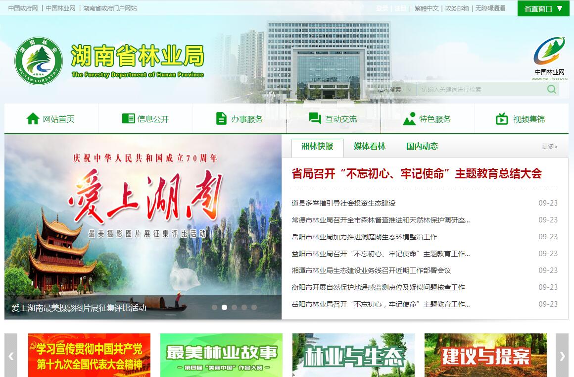湖南省林业局主要职责:(一)负责林业和草原及其生态保护修复的监督管理。拟订林业和草原及其生态保护修复的政策、规划、标准并组织实施,按规定起草相关地方性法规、规章草案。组织开展森林、草原、湿地、荒漠和陆生野生动植物资源动态监测与评价。(二)组织林业和草原生态保护修复和造林绿化工作。组织实施林业和草原重点生态保护修复工程,指导公益林和商品林的培育,指导、监督全民义务植树、城乡绿化工作,组织指导林木花卉工作。指导林业和草原有害生物防治、检疫工作。承担林业和草原应对气候变化的相关工作。承担省绿化委员会的具体工作。(三)负责森林、草原、湿地资源的监督管理。组织编制并监督执行全省森林采伐限额。负责林地管理,拟订林地 保护利用规划并组织实施,指导公益林划定和管理工作,管理国有森林资源。负责草原禁牧、草畜平衡和草原生态修复治理工作,监督管理草原的开发利用。负责湿地生态保护修复工作,拟订湿地保护规划和相关标准,监督管理湿地的开发利用。(四)负责监督管理石漠化防治工作。组织开展荒漠调查,组织拟订防沙治沙、石漠化防治及沙化土地封禁保护区 建设规划,拟订相关标准,监督管理沙化土地的开发利用,组织、指导建设项目对土地沙化影响的审核,组织沙化灾害预测预报和应急处置。(五)负责陆生野生动植物资源监督管理。组织开展陆生野生动植物资源调查,拟订及调整省级重点保护的陆生野生动物、植物名录,指导陆生野生动植物的救护繁育、栖息 地恢复发展、疫源疫病监测监督管理陆生野生动植物猎捕或采集、驯养繁殖或培植、经营利用,按分工监督管理野生动植物进出口。(六)负责监督管理各类自然保护地。拟订各类自然保护地规划和相关标准。负责国家公园设立、规划、建设和特许经营等工作,负责中央委托省政府或由省政府直接行使所有权的国家公园等自然保护地的自然资源资产管理和国土空间用途管制。提出新建、调整各类自然保护地的审核建议并 按程序报批,组织审核世界自然遗产的申报,会同有关部门审核自然与文化双重遗产的申报。负责生物多样性保护相关工作。(七)负责推进林业和草原改革相关工作。拟订集体林权制度、国有林场、草原等重大改革意见并监督实施。拟订农村林业发展、维护林业经营者合法权益的政策措施,指导农村林地承包经营工作。开展退耕(牧)还林还草,负责天然林保护工作。(八)拟订林业和草原资源优化配置及木材利用政策,拟订相关林业产业标准并监督实施,组织、指导林产品质量 监督,指导生态扶贫相关工作。(九)指导国有林场基本建设和发展,组织林木种子、草种种质资源普查,组织建立种质资源库,负责良种选育推广,管理林木种苗、草种生产经营行为,监管林木种苗、草种质量。监督管理林业和草原生物种质资源、转基因生物安 全、植物新品种保护。(十)指导全省森林公安工作,监督管理森林公安队伍,指导全省林业重大违法案件的查处,负责相关行政执法监管工作,指导林区社会治安治理工作。(十一)负责落实综合防灾减灾规划相关要求,组织编制森林和草原火灾防治规划和防护标准并指导实施,指导开展防火巡护、火源管理、防火设施建设等工作。组织指导国有林场林区和草原开展宣传教育、监测预警、督促检查等防火工作。必要时,可以提请省应急管理厅,以省应急指挥机构名义,部署相关防治工作。(十二)监督管理林业和草原资金和国有资产,提出林业和草原预算内投资、财政性资金安排建议,按省政府规定权限,审核省级规划内和年度计划内投资项目。参与拟订林业和草原经济调节政策,组织实施林业和草原生态补偿工作。(十三)负责林业和草原科技、教育和外事工作,指导全省林业和草原人才队伍建设,组织实施林业和草原国际交流与合作事务,承担湿地、防治荒漠化、濒危野生动植物等国际公约履约工作。(十四)完成省委、省政府交办的其他任务。