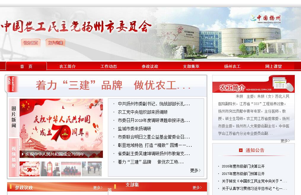 中国农工民主党(简称农工党)由革命先烈邓演达等同志于1930年8月9日在上海创建。中华人民共和国成立后,农工党是以医药卫生、人口资源和生态环境领域高中级知识分子为主、具有政治联盟特点、致力于建设中国特色社会主义事业的政党,是同中国共产党通力合作的参政党。农工党扬州市级组织于一九五六年十一月建立,1959年9月成立扬州市第一届委员会。目前为第十届委员会。至2016年11月,共有成员773人,其中高、中级知识分子占成员总数94.3%,在党员中医卫、环境保护、人口资源主界别占66%。农工党扬州市委现有苏北人民医院、扬州市第一人民医院和仪征市三个基层委员会,扬州大学、经济、广陵、邗江、高邮五个总支部委员会,共有基层组织46个。农工党扬州市委一直致力于参政议政、民主监督、社会服务,为扬州的社会经济发展建言献策,添砖加瓦。五年来,市委共提交各种议案、提案600多件,反映社情民意1300多条,开展各类社会服务活动500多次。农工党扬州市委4次获得农工党中央表彰,基层组织8次获得农工党中央先进称号,18名党员获得农工党中央嘉奖,连续三年获得农工党中央理论研究一等奖。在农工党江苏省委、中共扬州市委统战系统各项工作的评比中,均名列前茅。反映市委各项工作的宣传稿件,被国家级媒体采用244篇。