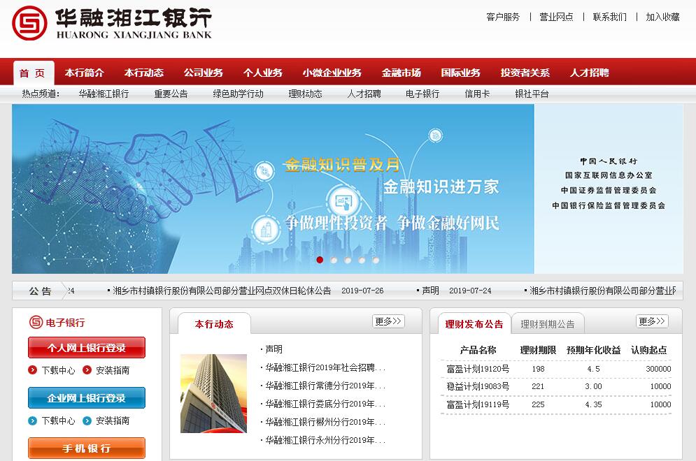 华融湘江银行股份有限公司(简称“华融湘江银行”)成立于2010年10月,是湖南省委、省政府引入中国华融资产管理股份有限公司,在重组湖南原株洲、湘潭、衡阳、岳阳市商业银行和邵阳市城市信用社的基础上,经原中国银行业监督管理委员会(现为中国银行保险监督管理委员会)批准,依法合并新设的一家注册地位于长沙市的国有股份制商业银行,注册资本人民币77.5亿元。成立以来,华融湘江银行紧紧围绕湖南经济社会发展战略,积极践行“立足湖南、依托湖南、支持湖南、服务湖南”的发展宗旨,坚持理念引导、规划先行、创新引领、风险为本、合规经营、从严治行,实现了稳健快速发展。截至2018年12月末,华融湘江银行总资产3354.52亿元、吸收存款2093.62亿元、各项贷款1822.61亿元。在湖南省14个市州设立分行,发起设立了湘乡市村镇银行,形成了覆盖全省的业务网络。人民银行综合评价为A类银行,主体信用评级AAA。先后获得中国企业五星品牌、全国金融系统企业文化建设先进单位、湖南100强企业、湖南服务业50强企业、支持湖南地方经济发展一等奖、湖南小微企业金融服务先进单位、湖南金融消费权益保护评估A类机构、湖南省综治工作“先进单位”、省级“平安单位”等荣誉200余项。