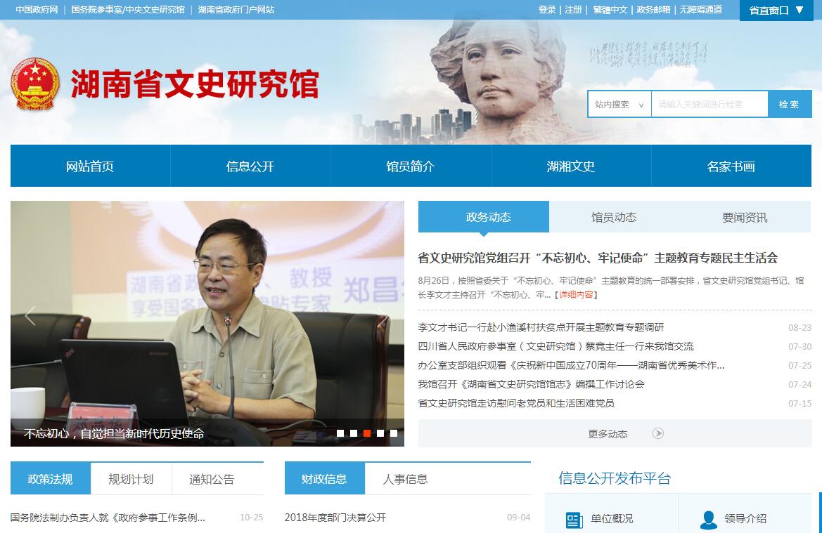 新中国成立以后,党和政府为了安置和照顾社会上德高望重、生活困难的老年学者,毛泽东主席提出设立一个特殊的“文史研究机构”。湖南省文史研究馆成立于1953年1月21日,是具有统战性、荣誉性的正厅级单位。建馆以来几易其名,先后称省人民政府文史研究馆、省人民委员会文史研究馆、省革命委员会文史研究馆,1980年2月复称省人民政府文史研究馆,1989年更名为省文史研究馆至今。2000年机构改革时与省参事室合署办公。建馆初期,省人民政府聘请著名语言文字学家杨树达为首任馆长,并聘请了有学识、声望、生活困难的文人耆宿为文史馆馆员,使之“老有所养、老有所为”。这些馆员中有的是由毛泽东、刘少奇等党和国家领导人推荐的党外名老教师、专家学者、民主爱国志士。截止2016年10月,累计聘任文史研究馆馆员408人。党的十一届三中全会以后,文史研究馆吸收了一批有丰富文史知识或书画专长的离退休知识分子整理文献、校点古籍,举办书画展览等活动,文史研究馆工作得以恢复并有所创新。1988年,国务院下发《关于改进省、自治区、直辖市文史研究馆工作的通知》(国发〔1988〕57号),明确了馆员聘任的条件和对象,主要从工作岗位上退下来的民主党派成员和党外爱国人士中聘任馆员。1995年,国务院办公厅印发《关于进一步做好文史研究馆工作的意见的通知》(国办发〔1995〕21号),进一步明确了新时期文史馆工作的特点和任务,扩大了馆员聘任的范围,开始聘任在文史及书画艺术界知名度高、影响大、熟悉统战工作的中共党员为馆员,文史馆工作有了新的生机和活力,馆员也由解放初期的“文、老、贫”逐步转变为“文、老、名”。2009年,根据温家宝总理的讲话精神,文史馆员新增参政咨询、调查研究的任务。此后,馆员们围绕全省的中心工作,结合自身文化专长,深入开展调查研究,为省委、省政府决策提供了许多有价值的意见和建议。文史研究馆现有馆员91人,主要从事文学、史学、法学、文物、考古、编辑、教育、书法、美术、音乐、戏剧等工作,被社会誉为人才库、现代“翰林院”。馆员们本着“量力而行,尽力而为,因人而异,各展所长”的原则,为继承和发扬祖国优秀传统文化,促进社会主义文明建设和祖国统一大业发挥了积极作用。
