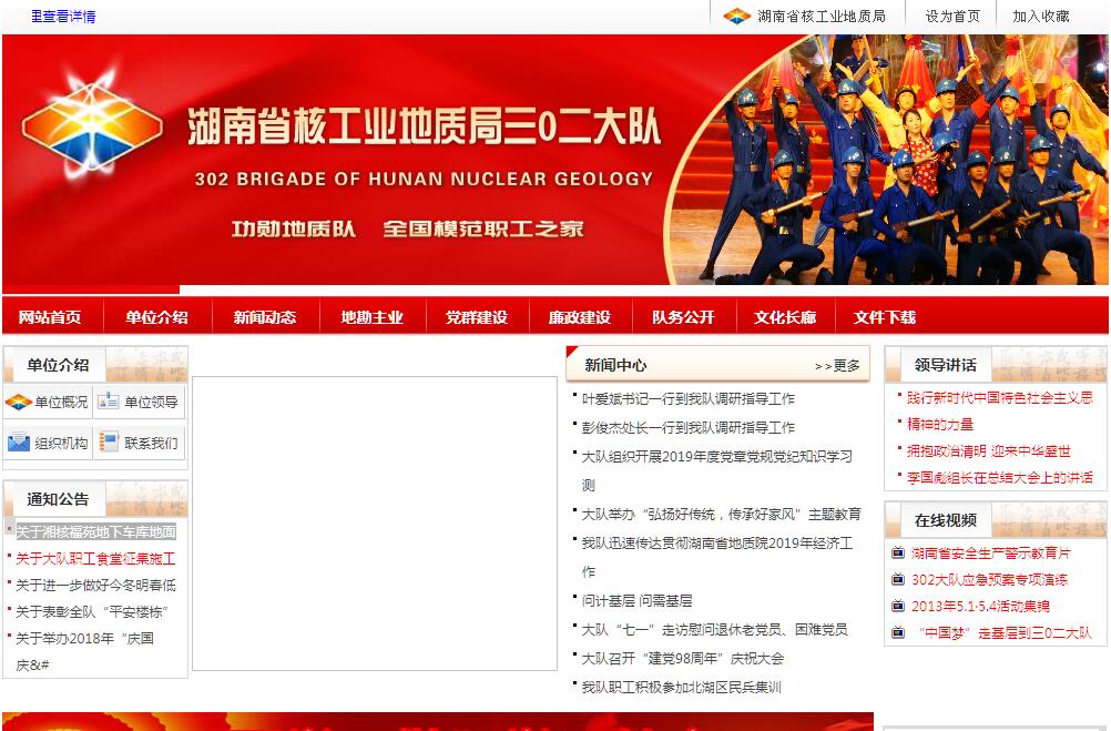 湖南省核工业地质局三0二大队是全国最早的铀矿地质勘查队伍之一,前身为1956年组建的三O九队第十队,队部现设郴州市北湖区。1964年4月1日,以第十队部分力量为基础,在湖南郴州汝城县集龙公社正式组建“中南三O九队第二队”。后单位名称几经变更,于2000年属地化管理后变更为现名。建队以来,共找到4种类型的铀矿床,提交了巨型矿田1个,大中型铀矿床13个,提交了包括新中国第一批自主探采铀矿在内的工业储量上万吨,所探明矿床现被开采利用,为我国国防建设和核电建设做出了重大贡献。1958年,参与提交的金银寨铀矿床是中南309队向国家提交的第一批工业储量中的三大矿床之一,为我国第一颗原子弹试验成功做出了突出贡献。大队最早应用地质力学理论总结铀成矿规律的《鹿井矿田构造体系研究》和《我国花岗岩型铀矿成矿规律及找矿地质数据》科研报告,荣获1978年全国科学大会奖。在核工业系统率先实现钻探“六大件”配套、金刚石小口径钻进技术和金刚石绳索取心钻进技术。先后有26项科研成果获国家和省部级成果奖,其中三项成果获国家科技进步一等奖。1992年,大队被中国核工业总公司授予“功勋地质队”殊荣。大队的文明创建工作硕果累累。在局内率先成功创建全国“模范职工之家”、“全国模范职工小家”、 “全国厂务公开民主管理先进单位”,获得了湖南省文明标兵单位、湖南省“厂务公开民主管理示范点单位”、湖南省“创建学习型党组织先进单位”等荣誉。